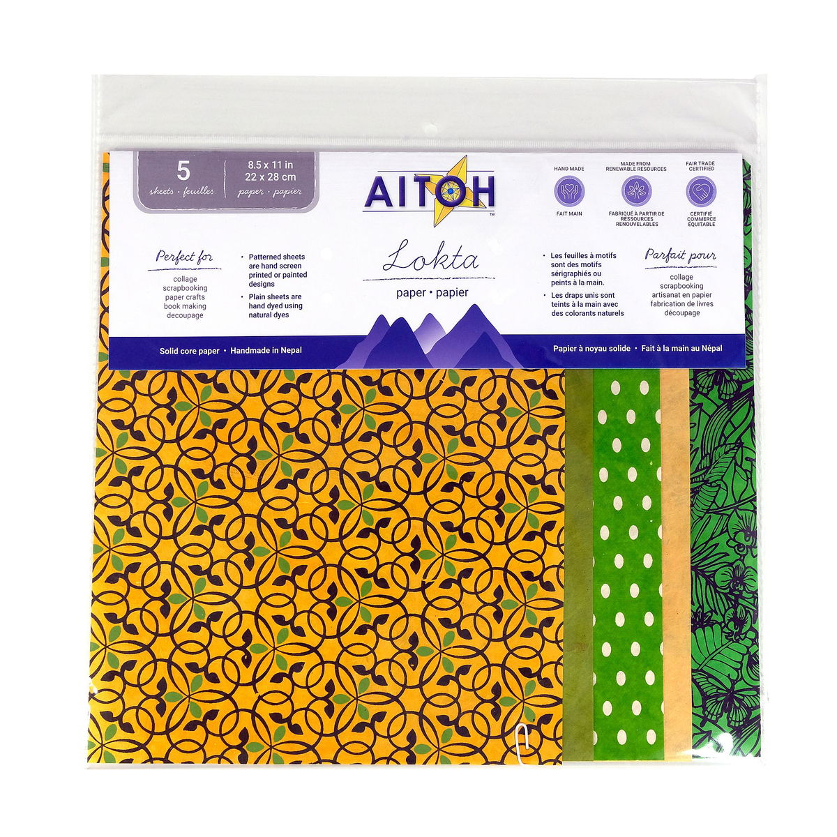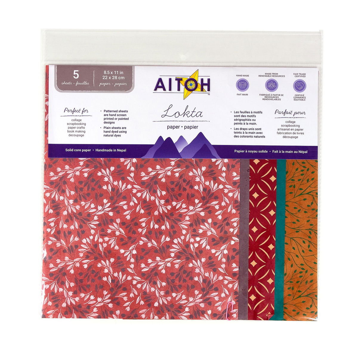 Lokta nepalí hecho a mano en un paquete de 3 patrones y 2 hojas a juego de colores sólidos. Ideal para encuadernación, manualidades con papel, collage, origami y mucho más. Cada paquete contiene cinco hojas de 21,5 x 28 cm, dispuestas dentro de un paquete de 30 x 30 cm, de modo que se ve una sección de cada papel.