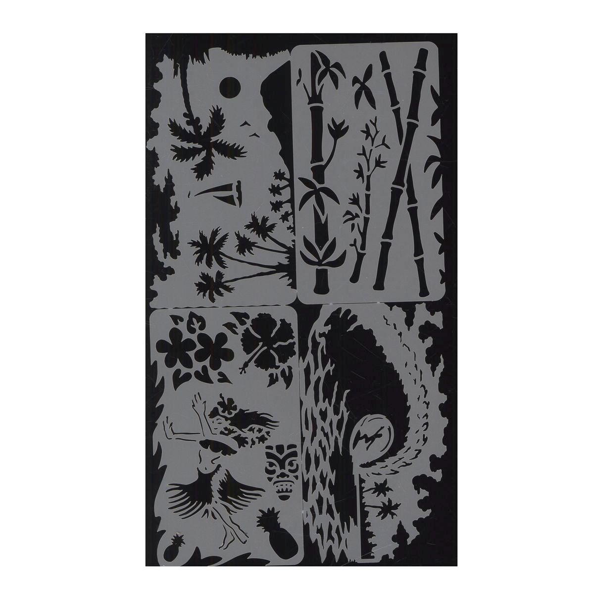 Tan pequeñas que caben en tu caja de paletas, estas cuatro tarjetas de plantillas tamaño cartera ofrecen una sorprendente versatilidad en un formato portátil. Dennis Mathewson diseñó cada plantilla en torno a elementos tropicales esenciales: tallos de bambú, hojas de palmera, olas ondulantes y motivos isleños, que se combinan para crear escenas completas o realzar composiciones existentes. Su tamaño compacto las hace ideales para lienzos pequeños y trabajos de detalle donde las plantillas de tamaño completo ocupan demasiado espacio.