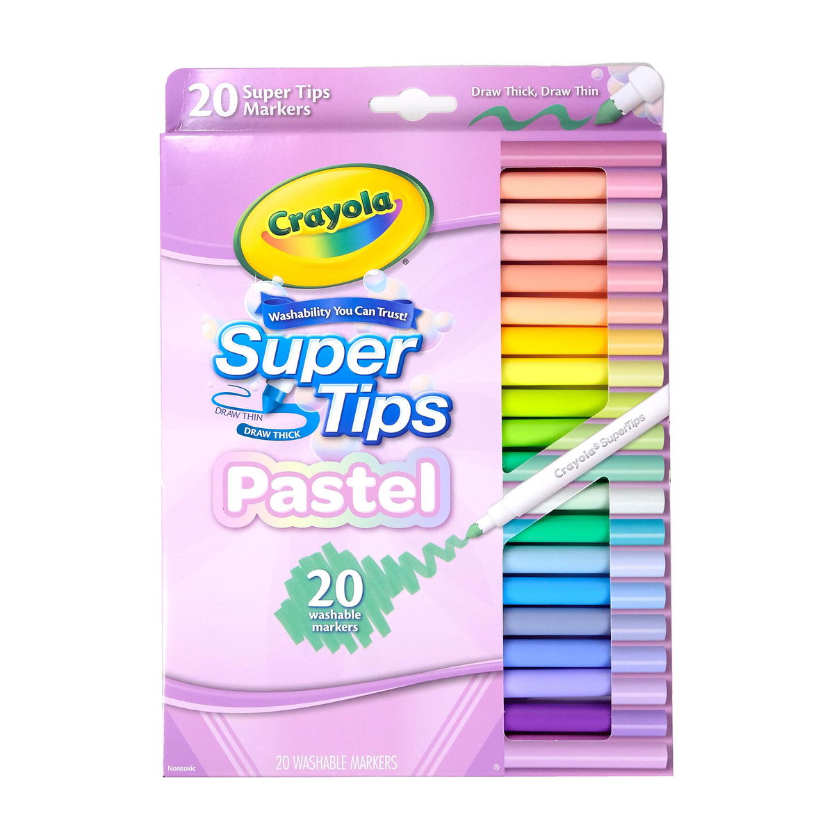 El diseño de doble punta te ofrece dos grosores de línea en un solo marcador: trazos gruesos para rellenar áreas y puntas finas para detalles y letras. La construcción Supertip de Crayola mantiene ambas formas de punta con el uso continuo, lo que te permite cambiar de técnica sin necesidad de usar diferentes herramientas. Veinte tonos pastel ofrecen una paleta de colores suave y contemporánea ideal para todo, desde diseños de bullet journal hasta tarjetas de felicitación.
