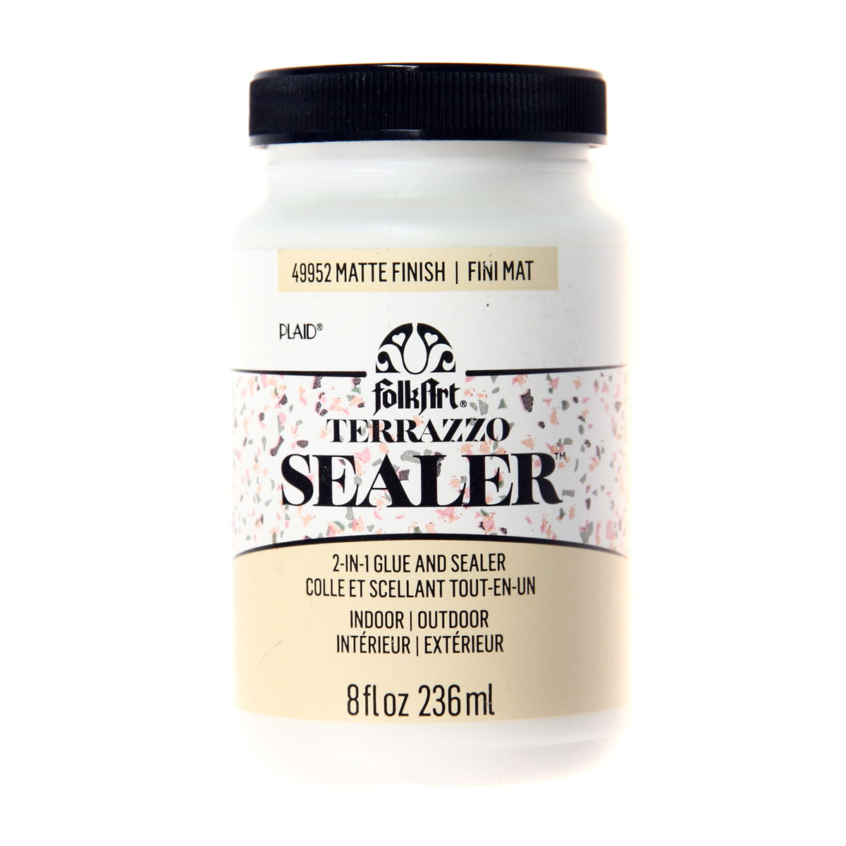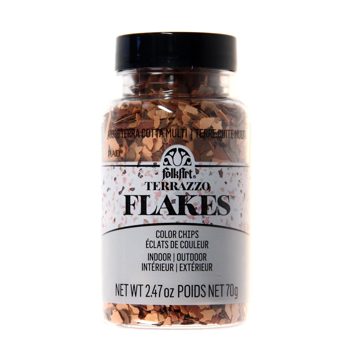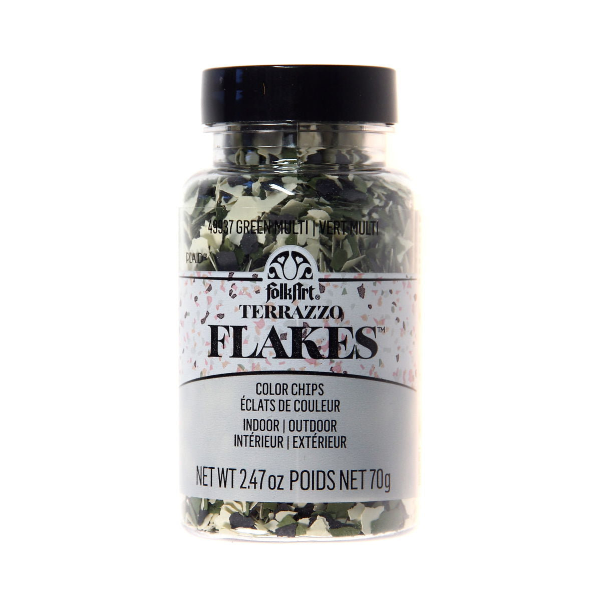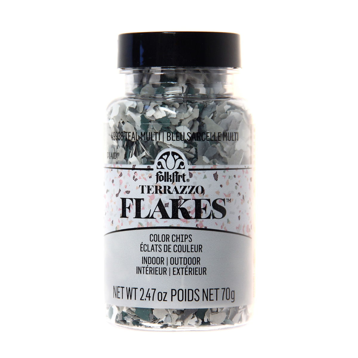 Muestras de colores variados y un método fiable para incrustarlas. FolkArt ofrece ambas cosas en un único sistema coordinado. Las propias escamas mezclan múltiples colores y tamaños en cada envase, eliminando la tediosa tarea de mezclar lotes separados para lograr una auténtica variación de terrazo. Su sellador complementario funciona como base adhesiva y capa protectora, simplificando lo que de otro modo sería un proceso con varios productos.