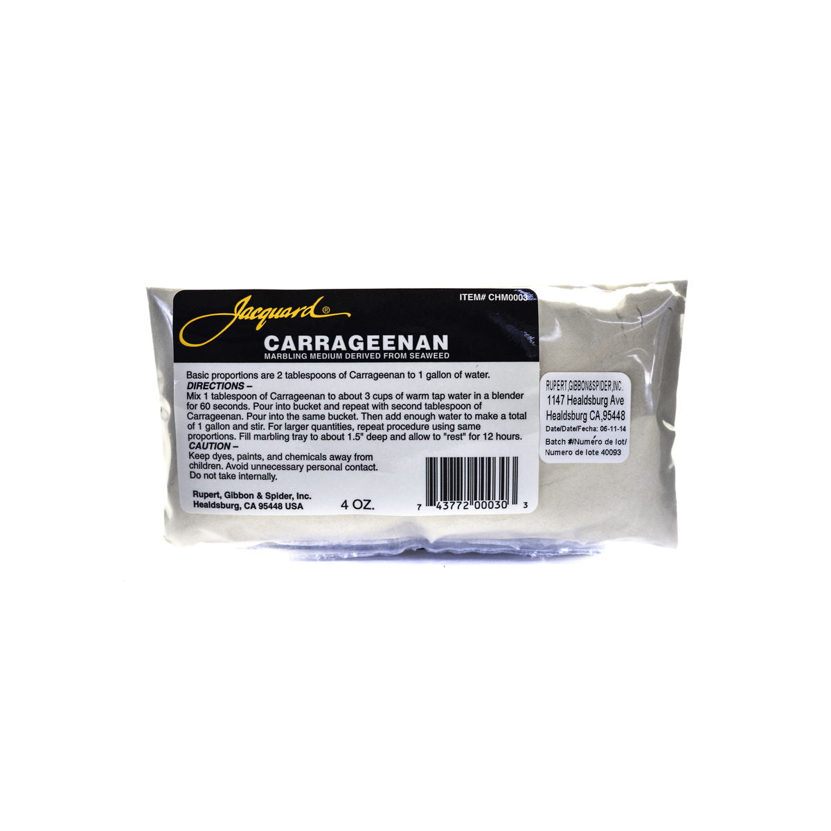 La carragenina es un agente gelificante natural de algas marinas que proporciona una superficie viscosa para el marmoleado sobre tela y papel. Las proporciones básicas son 2 cucharadas de carragenina por 1 galón de agua. En una licuadora, mezcle 1 cucharada de carragenina en aproximadamente 3 tazas de agua tibia del grifo durante 60 segundos. Vierta la mezcla en un balde y repita el proceso con la segunda cucharada de carragenina. Vierta la segunda mezcla en el balde con la primera mezcla. Luego, agregue suficiente agua para completar un total de 1 galón y revuelva. Para cantidades mayores, repita el procedimiento utilizando las mismas proporciones. Llene la bandeja para marmoleado hasta aproximadamente 1,5" de profundidad y deje reposar durante 12 horas.