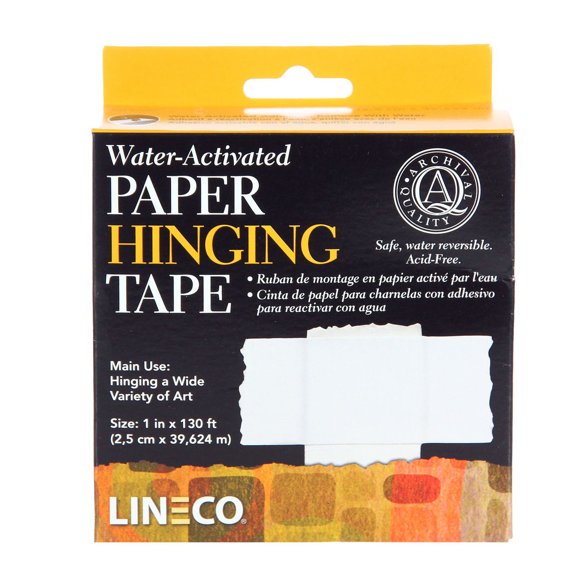 Ideal para fijar obras de arte pesadas sobre papel. Gracias a su alta resistencia a la tracción, también se puede usar para sellar la parte posterior de marcos de fotos y los laterales de placas de vidrio fotográficas. La base de la cinta tiene un pH de 8,5 y un 3 % de carbonato de calcio. El recubrimiento adhesivo especial de PVA de la cinta se activa con agua, es reversible y tiene un pH aproximado de 7,0.