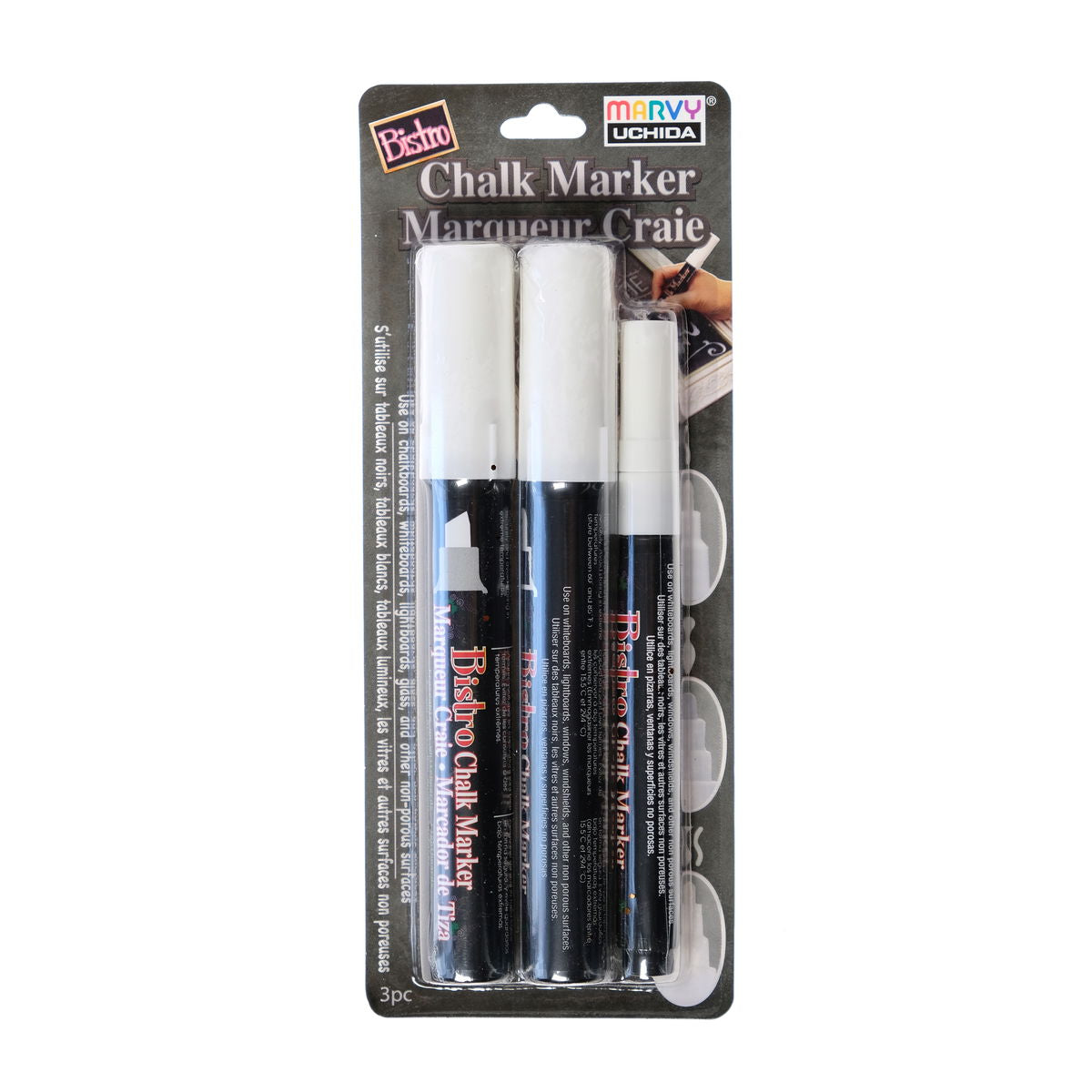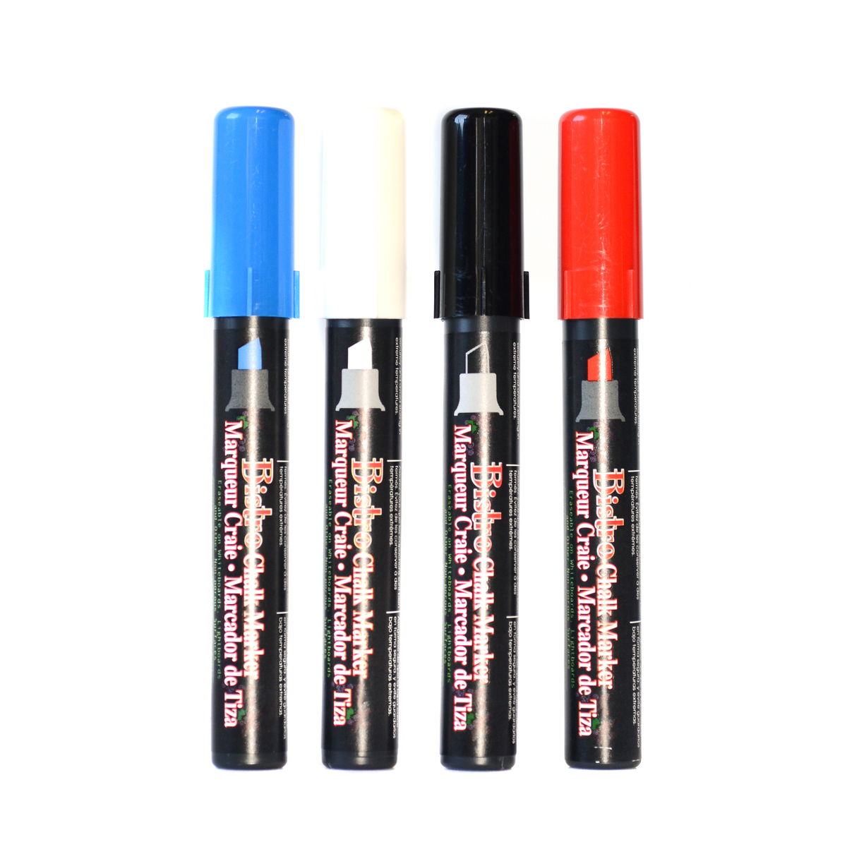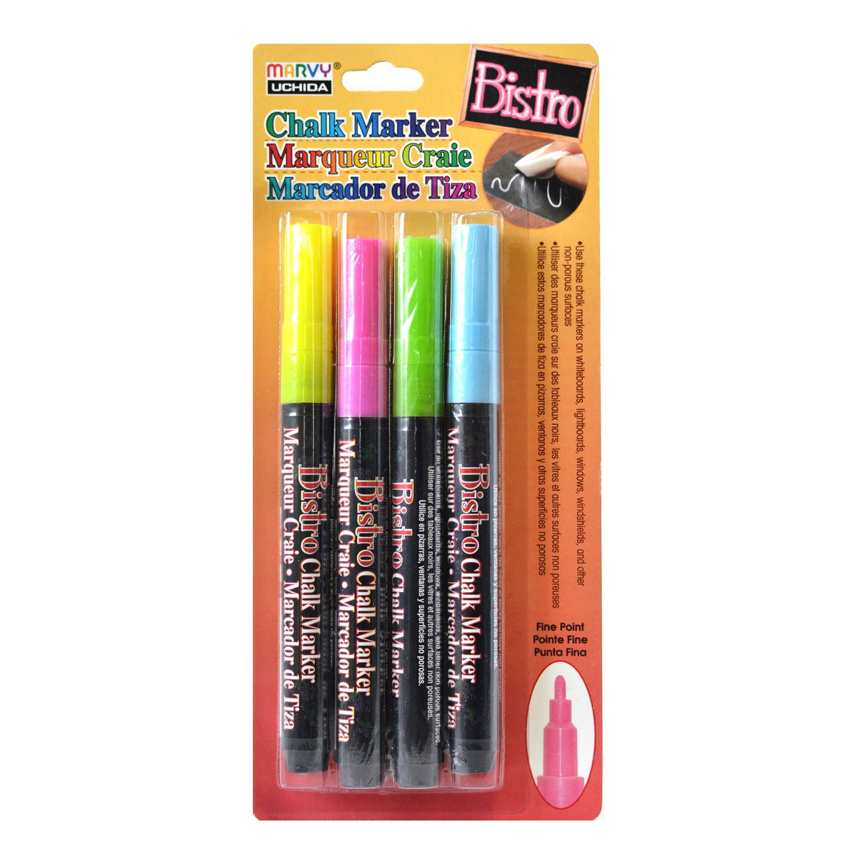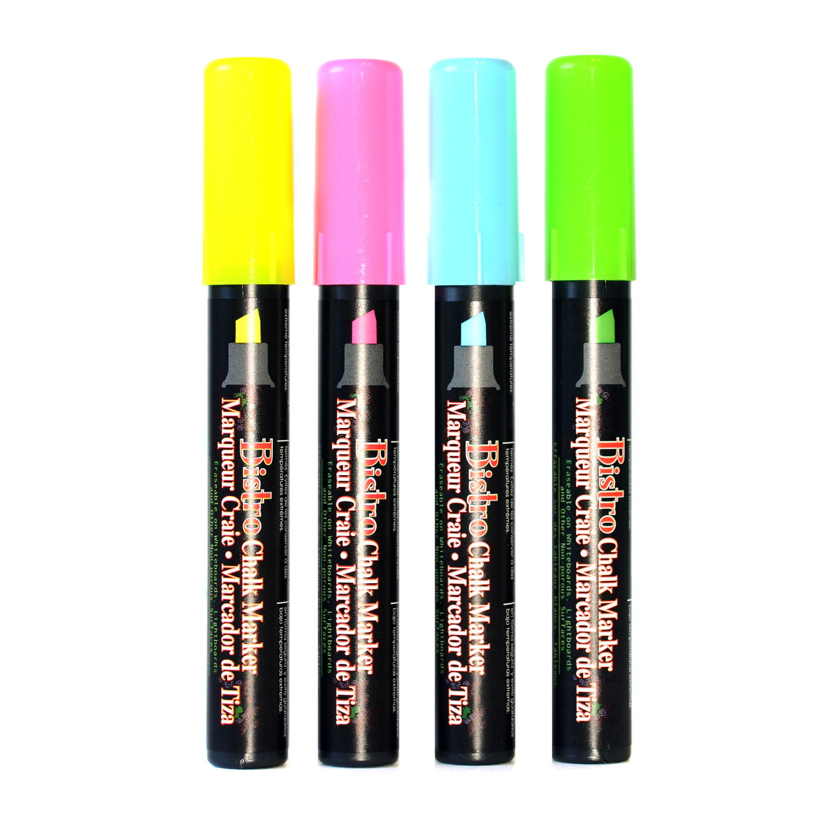 Los marcadores de tiza Bistro están disponibles en juegos de 4 colores surtidos, con punta fina, punta gruesa o biselada. Úsalos para escribir o dibujar en pizarras, pizarras luminosas, ventanas, parabrisas y otras superficies no porosas. Crea arte o diseña un mensaje llamativo prácticamente en cualquier lugar. La tinta a base de agua es opaca y se borra con un paño húmedo una vez seca, lo que facilita la limpieza.