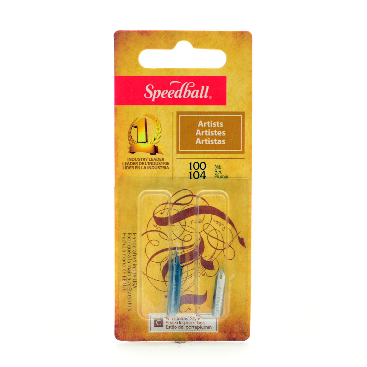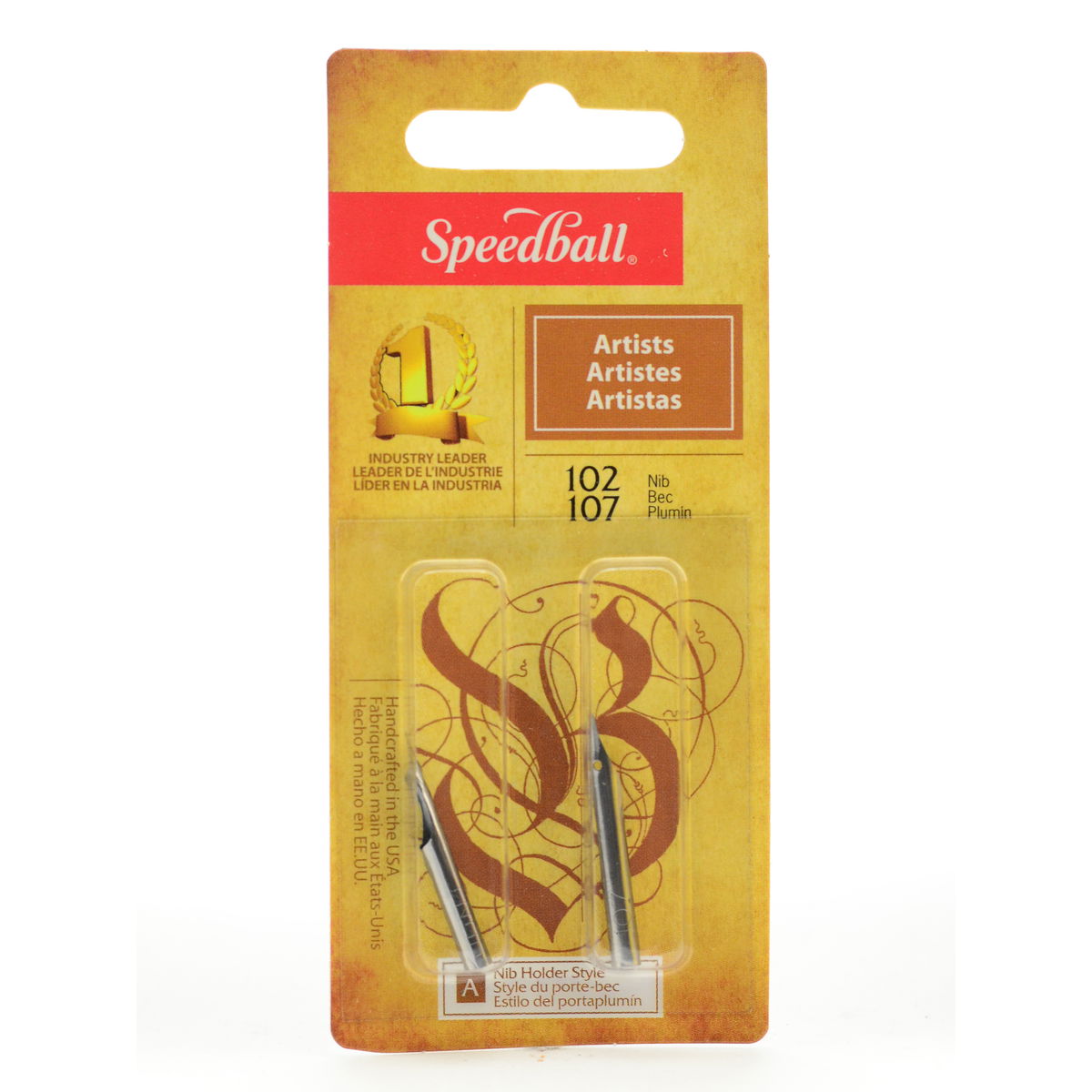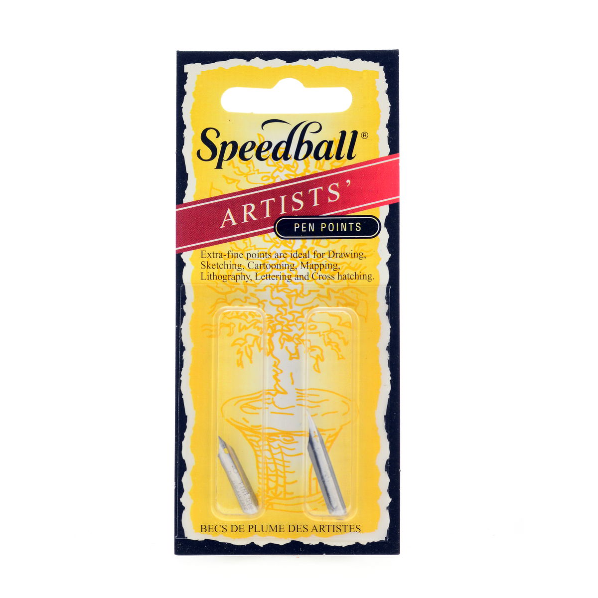 Puntas Speedball Artist en paquetes surtidos para una variedad de opciones. Diseñadas con diferentes anchos de línea y grados de rigidez para un control perfecto: 22B Extrafina: para escritura ornamental y rayado fino (rigidez media); 56 Escolar: pluma de dibujo fina para escuelas de arte, acción rígida; 99 Dibujo: punta extrafina para dibujantes y litógrafos; 100 Artista: línea muy delicada para expertos; 101 Imperial: muy flexible para trabajos ornamentales; 102 Pluma Crow: la pluma artística más popular de Estados Unidos. Superfina y flexible; 103 Mapping: para mapeo y trabajos de línea fina; 104 Finest: pluma artística superfina para líneas finas y detalles minuciosos; 107 Pluma Hawk: punta superfina, más rígida que la 102, muy duradera. Para líneas largas y uniformes y detalles en cruz; 108 Pluma Flexible: para tramado, florituras y litografía; 512 Punta Bowl: pluma fina para rayado y rotulación; 513EF Globo: punta bowl extrafina para artes industriales.