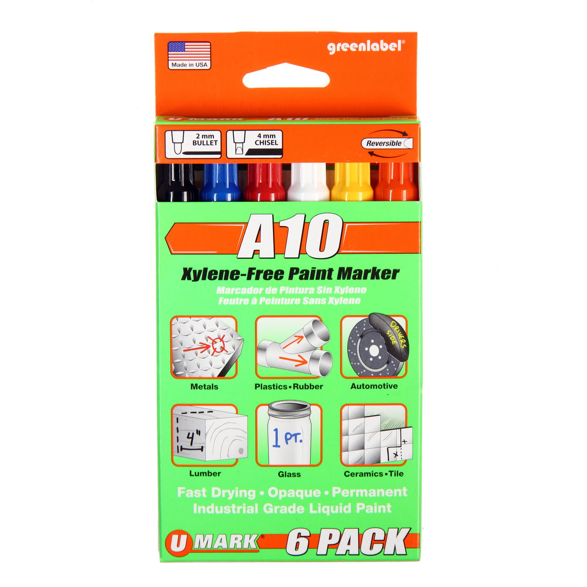 El marcador de pintura U-Mark A10 es altamente visible y permanente en la mayoría de las superficies, como metales, plásticos, madera, vidrio, cerámica, cartón corrugado y más. Por eso, este marcador es el preferido por usuarios industriales de alto volumen, pero también es ideal para marcar, codificar por colores y etiquetar en casa. Cada punta resistente es reversible: punta redonda de 2 mm o punta biselada de 4 mm. Disponible en un juego de 6 colores: negro, azul, rojo, blanco, amarillo y naranja.