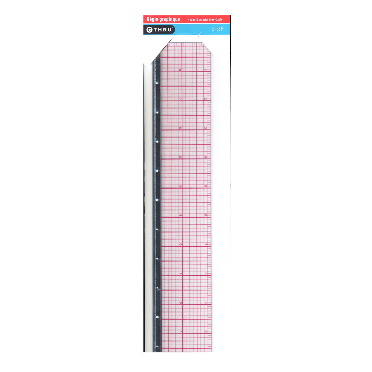 Estas prácticas reglas gráficas de octavos son transparentes para mayor visibilidad y biseladas para facilitar el trabajo con tinta. Los bordes están calibrados a dieciseisavos de pulgada con una escala de centrado a cero en el centro. Están laminadas para mayor durabilidad. La B-85M incluye una tira de acero inoxidable en un borde para evitar cortes al usar un cuchillo o una navaja.