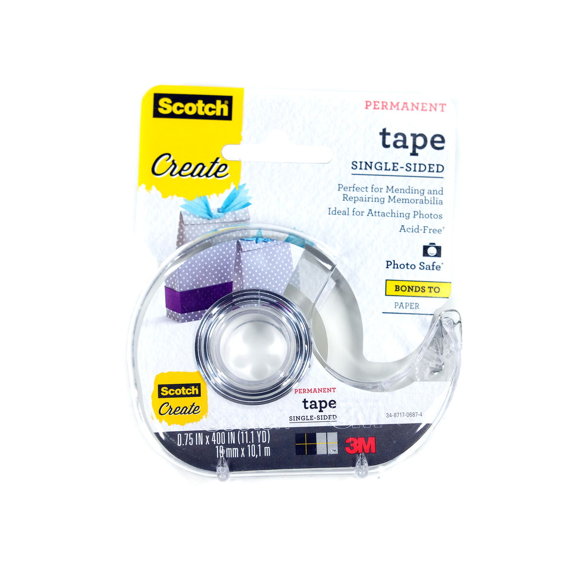 Scotch Scrapbooking Tape is perfect for mending, repairing, and mounting photographs, documents, and memorabilia. This long lasting, clear, photo safe, and acid-free tape resists moisture and permanently bonds most surfaces. The tape is independent laboratory tested, safe for both back and front sides of photos.