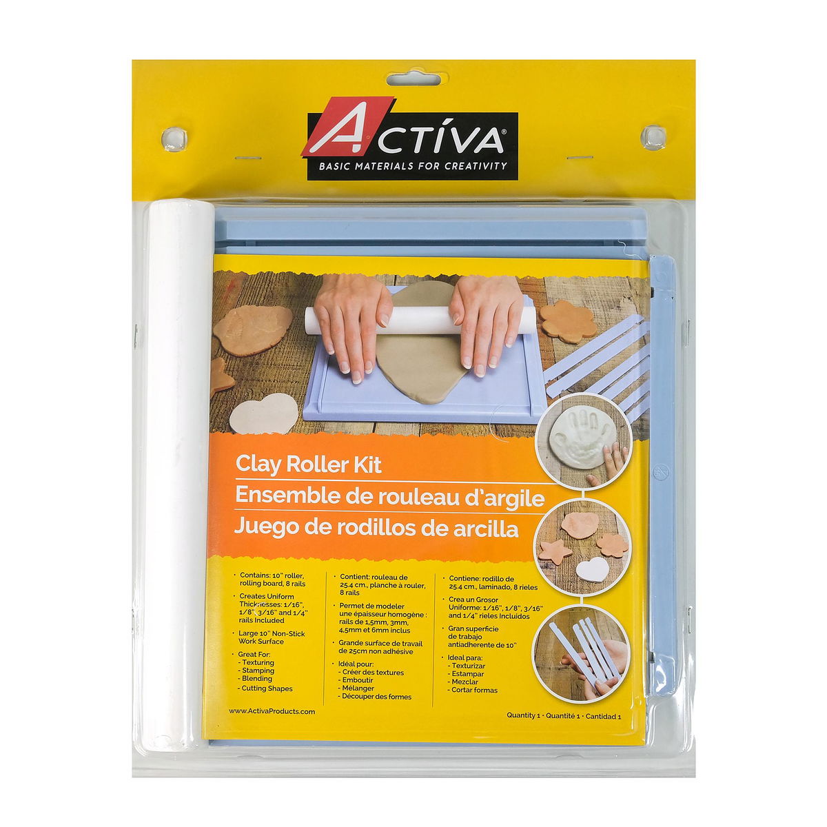Great for hand built clay projects! The Activa Clay Roller Kit offers a smooth rolling surface, a rolling pin and 4 sets of rails for consistency of height in 4 sizes when rolling out your clay. Included in the kit are a 10 in. rolling board and pin. Plus sets of rails in 1/16 in., 1/8 in., 3/16 in. and 1/4 in. The 10 in. board gives you a non-stick surface to work on when texturing, stamping, blending or cutting clay.