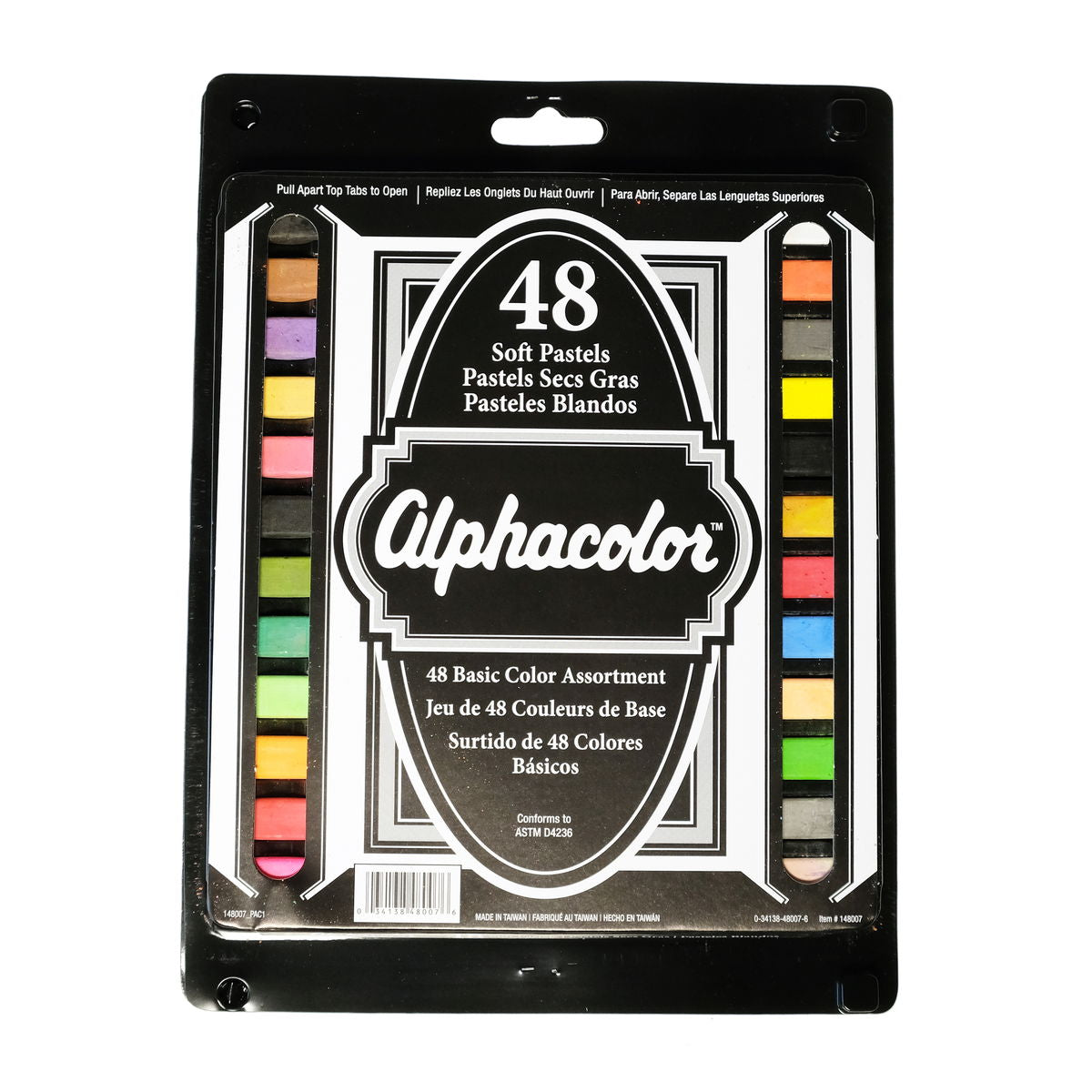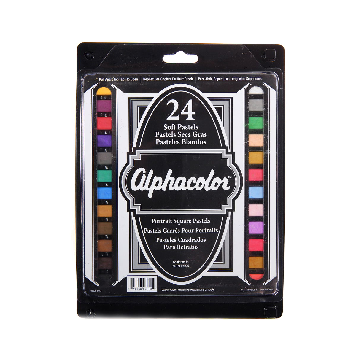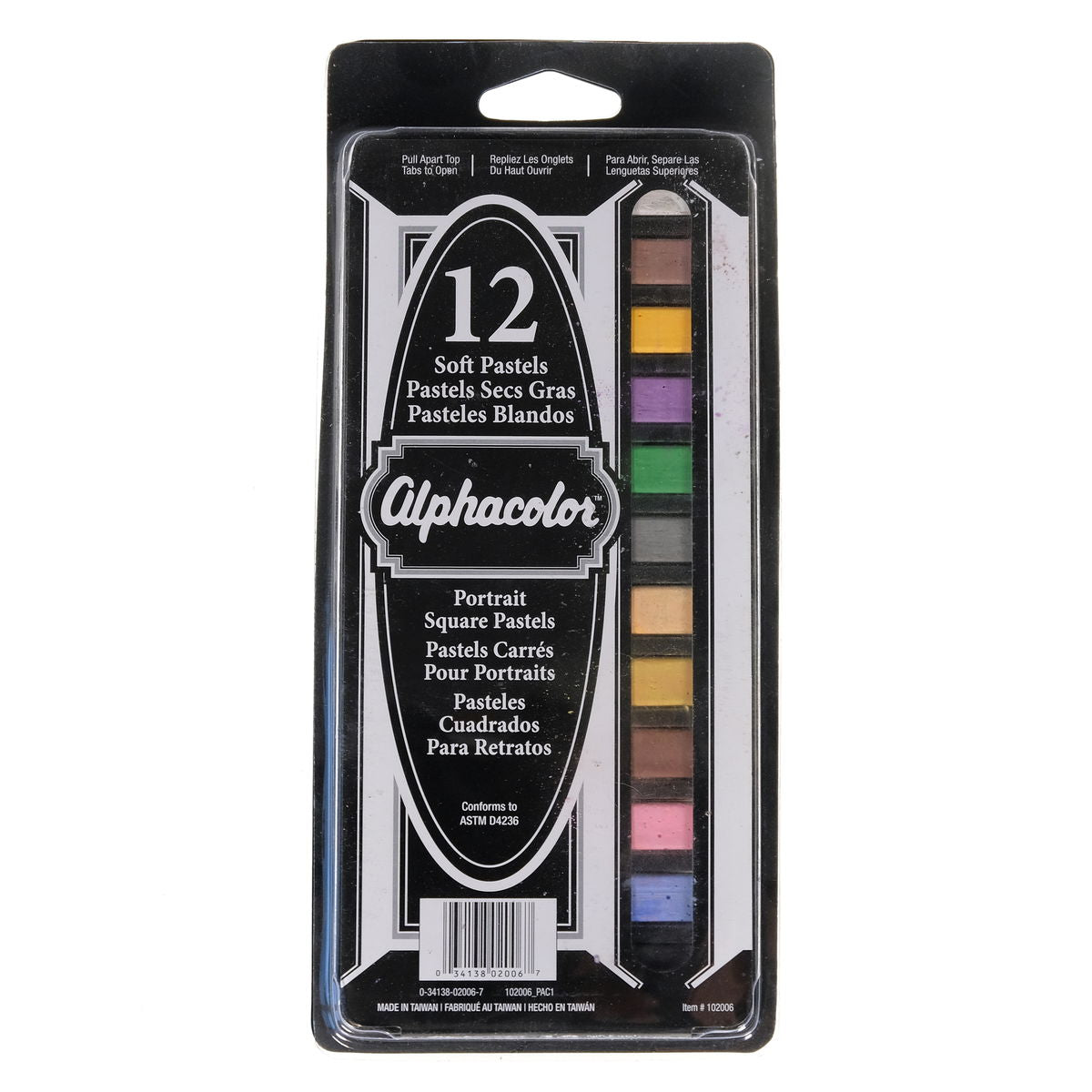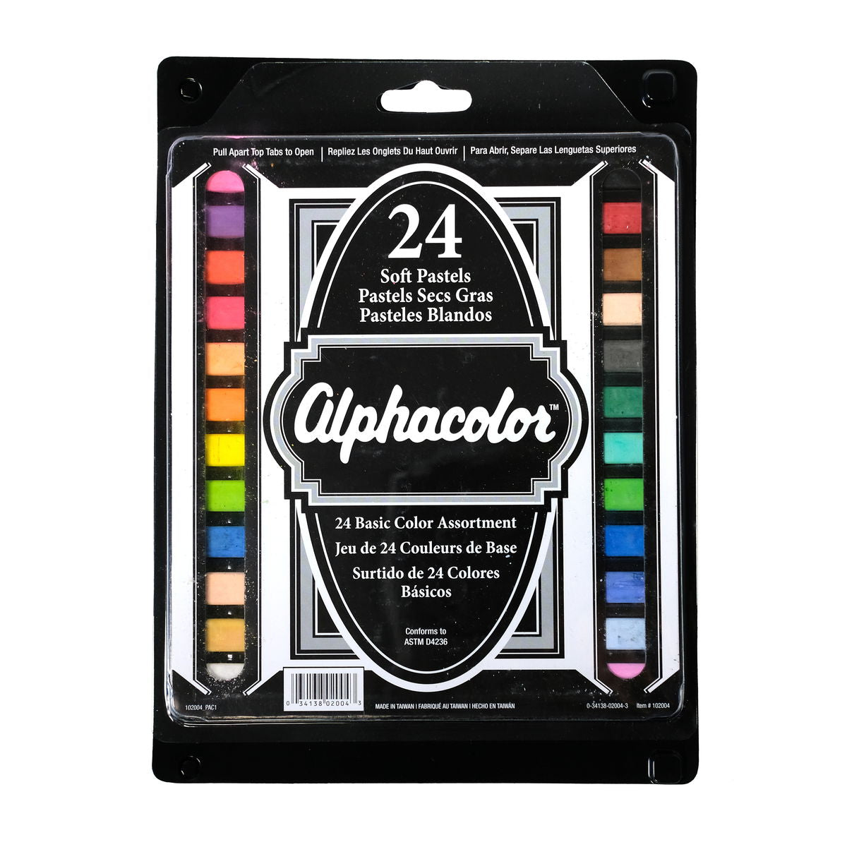 Rich in pigment, these pastels produce a velvety smooth laydown for creating bright drawings, posters, and murals on cloth or paper. Alphacolor pastels offer vibrant, non-toxic coverage that is specially formulated to last. (Not recommended for chalkboards.) Colors contained in sets:Pure bright white, set of 12: Use for dramatic negative works. Perfect for working in reverse on darker papers. Basic colors, set of 12: black, blue, brown, green, light blue, ochre, orange, peach, red, white, yellow, yellow-green.Earth colors, set of 12: black, dark brown, burnt sienna, brown, earth, deep orange, golden ochre, medium yellow, ochre, orange, red earth, yellow-orange.Hi-fi grays, set of 12: very light gray (two), light gray, gray, medium gray, dark gray, black, white.Portrait colors, set of 12: emerald green, black, blue, dark brown, earth, peach, medium gray, maroon, ochre, red earth, white, pink.Landscape colors, set of 24: black, blue, light blue, dark blue, brown, dark brown, earth, peach, gray, very light gray, dark green, emerald green, light green, olive green, ochre, orange, red, red earth, red-orange, deep turquoise, violet, white, yellow, yellow-green.Portrait colors, set of 24: emerald green, black, blue, dark brown, earth, peach, medium gray, maroon, ochre, red earth, white, pink, auburn, deep pink, light blue, brown, burnt sienna, deep peach, very light gray, light green, violet, golden ochre, red, red-orange.Basic colors, set of 24: black, blue, brown, green, light blue, ochre, orange, peach, red, white, yellow, yellow-green, blue-green, burnt sienna, dark blue, dark green, earth, gray, magenta, red-orange, red-violet, turquoise, violet, yellow-orange.Basic colors, set of 48: extra black and white, blue, brown, green, light blue, ochre, orange, peach, red, yellow, yellow-green, blue-green, burnt sienna, dark blue, dark green, earth, gray, magenta, red-orange, red-violet, turquoise, violet, yellow-orange, blue-violet, cardinal red, dark brown, dark gray, deep orange, deep peach, deep turquoise, emerald green, fluorescent green, fluorescent orange, fluorescent red, fluorescent yellow, light gray, light green, maroon, medium gray, medium yellow, olive green, red earth, very light gray, gold ochre, ivory.