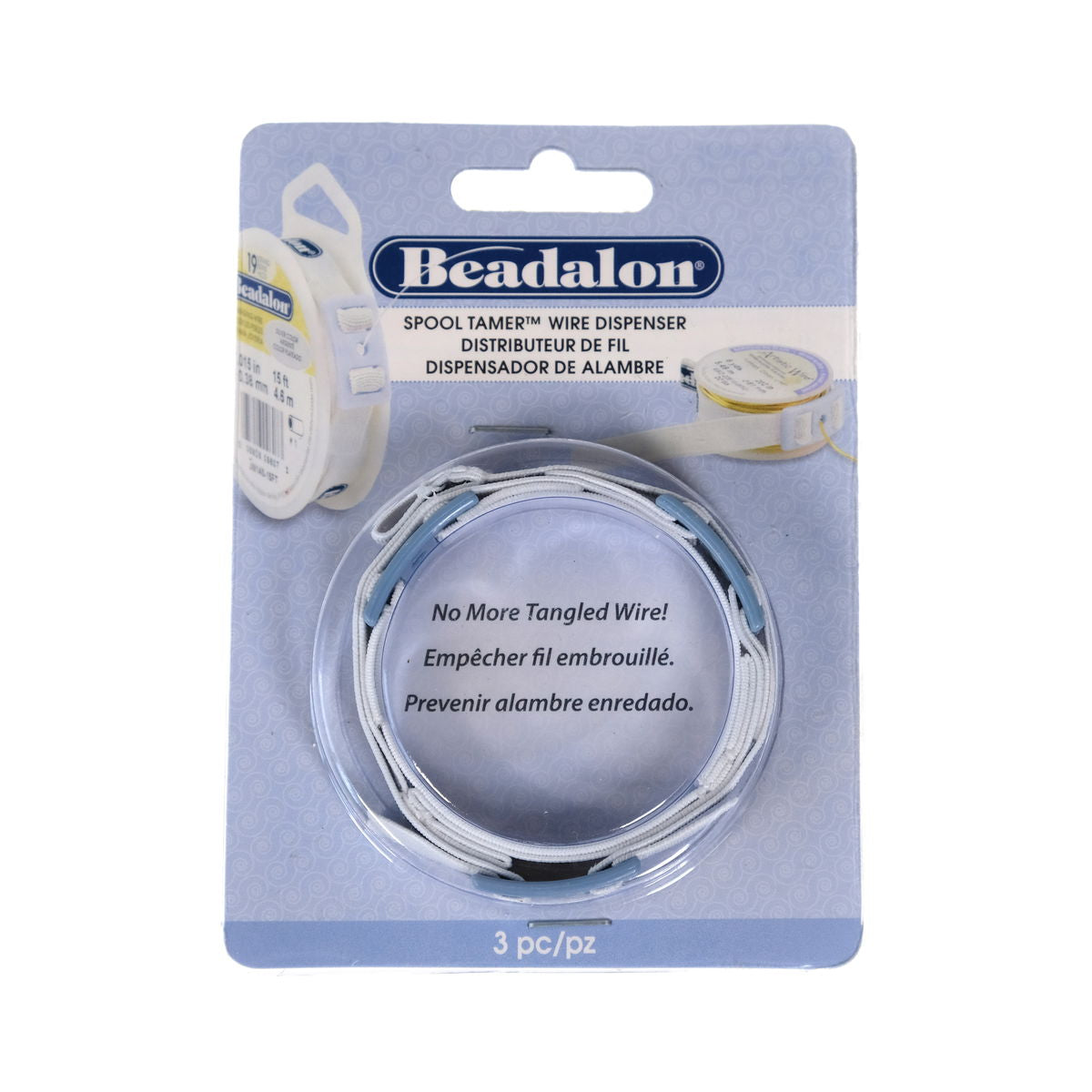 Put an end to tangled wire! The Spool Tamer is an adjustable wire dispenser that helps keep spooled Beadalon Bead String Wire and Artisitic Wire tidy and easily accessible. To use, thread the end of the wire or cord, through the hole in the buckle. Attach the band around the spool and tighten.
