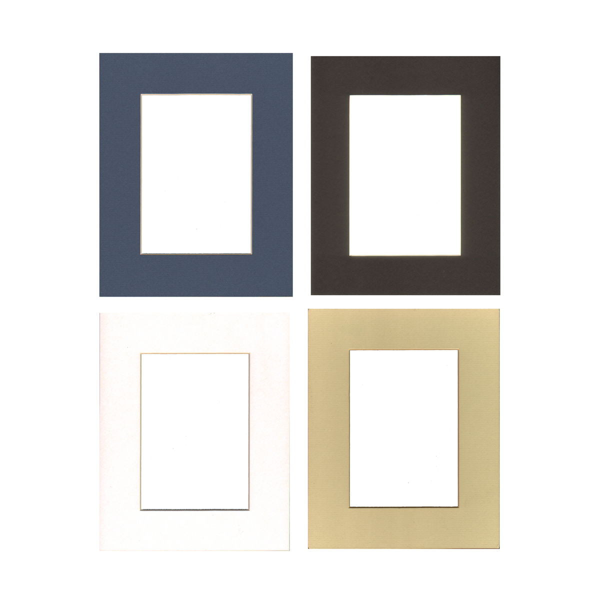 Beautiful beveled acid free pre-cut mats, economically bulk packed and shrink wrapped. No backing sheets. Perfect for large projects. Made in USA. 8 in. x 10 in. mats have 4.5 in. x 6.5 in. opening 11 in. x 14 in. mats have 7.5 in. x 9.5 in. opening 16 in. x 20 in. mats have 10.5 in. x 13.5 in. opening Assorted pack contains black, white, grey, and gulf blue.