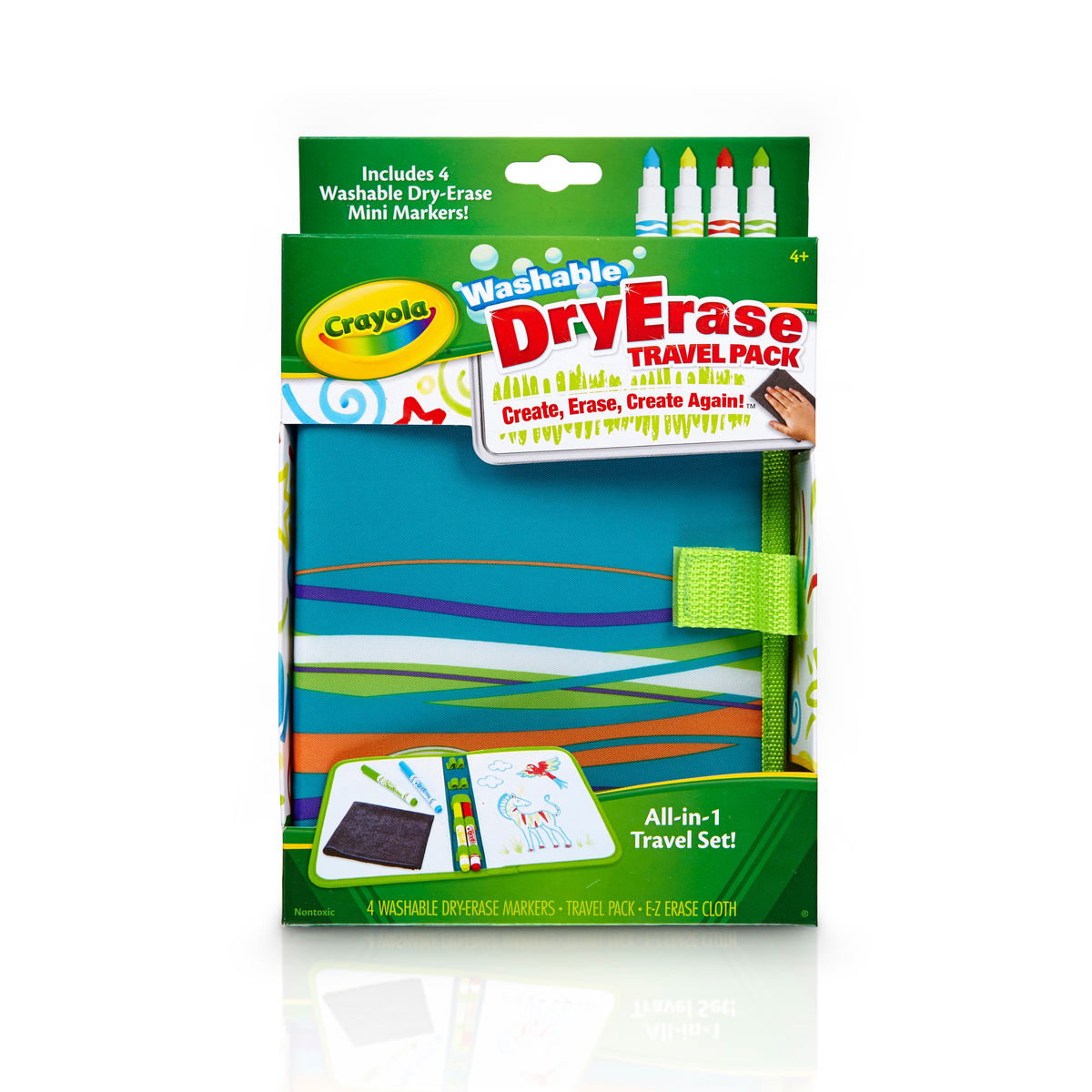 Great for mess-free drawing in the car or anywhere you go! The colorful Crayola Dry Erase Travel Pack unfolds into two reusable drawing surfaces. Draw or write with the included 4 Washable Dry Erase Markers. Wipe the surface clean with the E-Z erase cloth and start again.