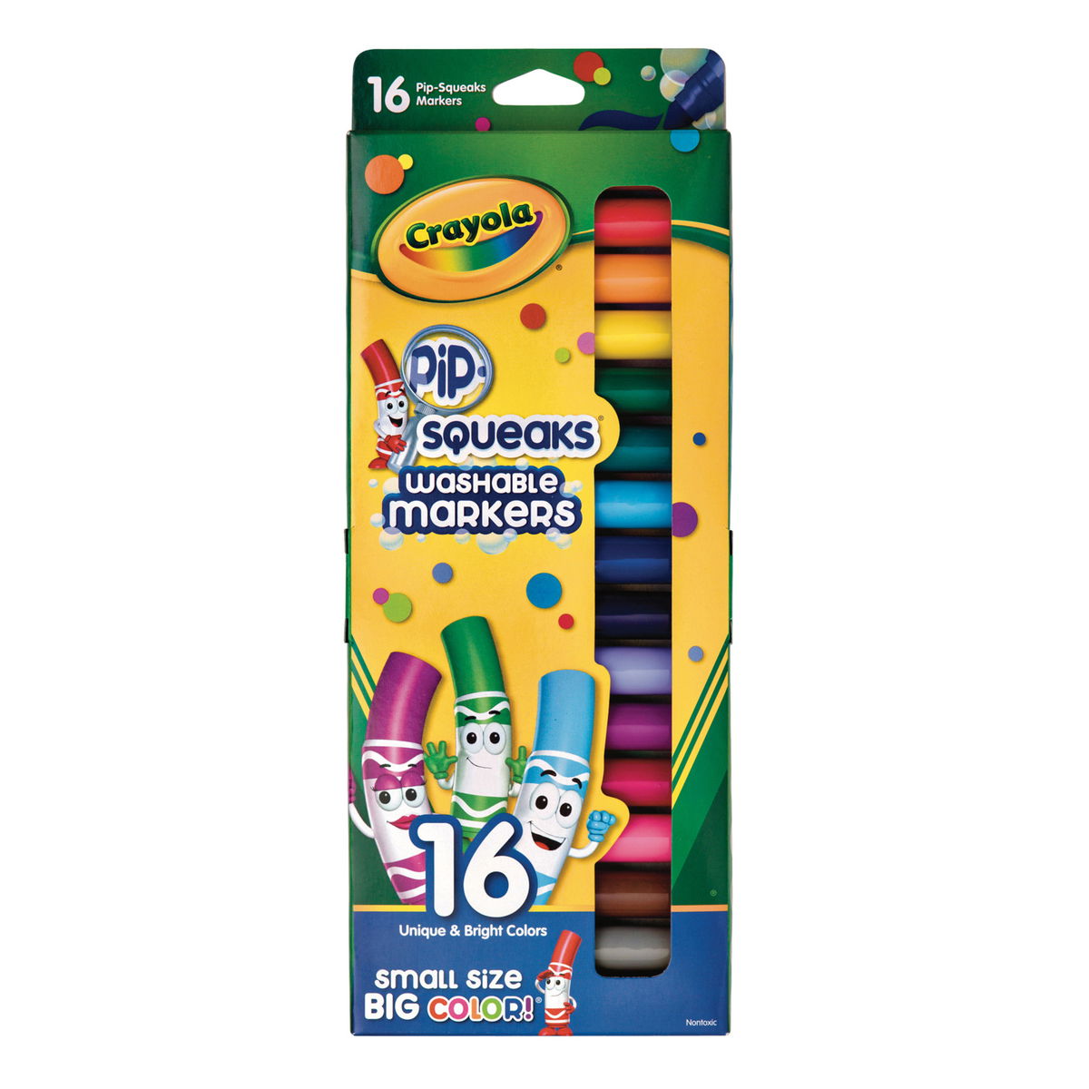 Pip-Squeaks may be small in size but they have BIG color! The small size of Crayola Pip-Squeaks Markers makes them easier for young children to hold and use. Their conical tips can draw thick or thin lines, and they have washable inks. Best of all, they have a re-usable pouch for easy storage. The set includes 16 fun colors: Leprechaun Green, Golden Nugget, Raspberry Squirt, Petite Rose, Tiny Plum, Teensy Teal, Rain Drop Blue, Copper Penny, Dinky Pink, Firefly Red, Toy Poodle Black, Mini Brown, Kitten Gray, Little Lemon, Sweet Violet and Little Boy Blue.