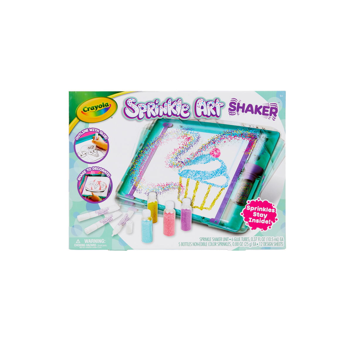 The Crayola Sprinkle Art Shaker allows kids to create glitter art without the usual cleanup. This portable art set makes it easy to decorate line art or blank paper with sprinkles while functioning as a less-mess, no-waste solution. Just create a design using the included glue or add glue to line art wherever you want sprinkles to stick. Then close up the case, shake and watch designs appear! A truly unique creative toy for kids ages 5 & up.
