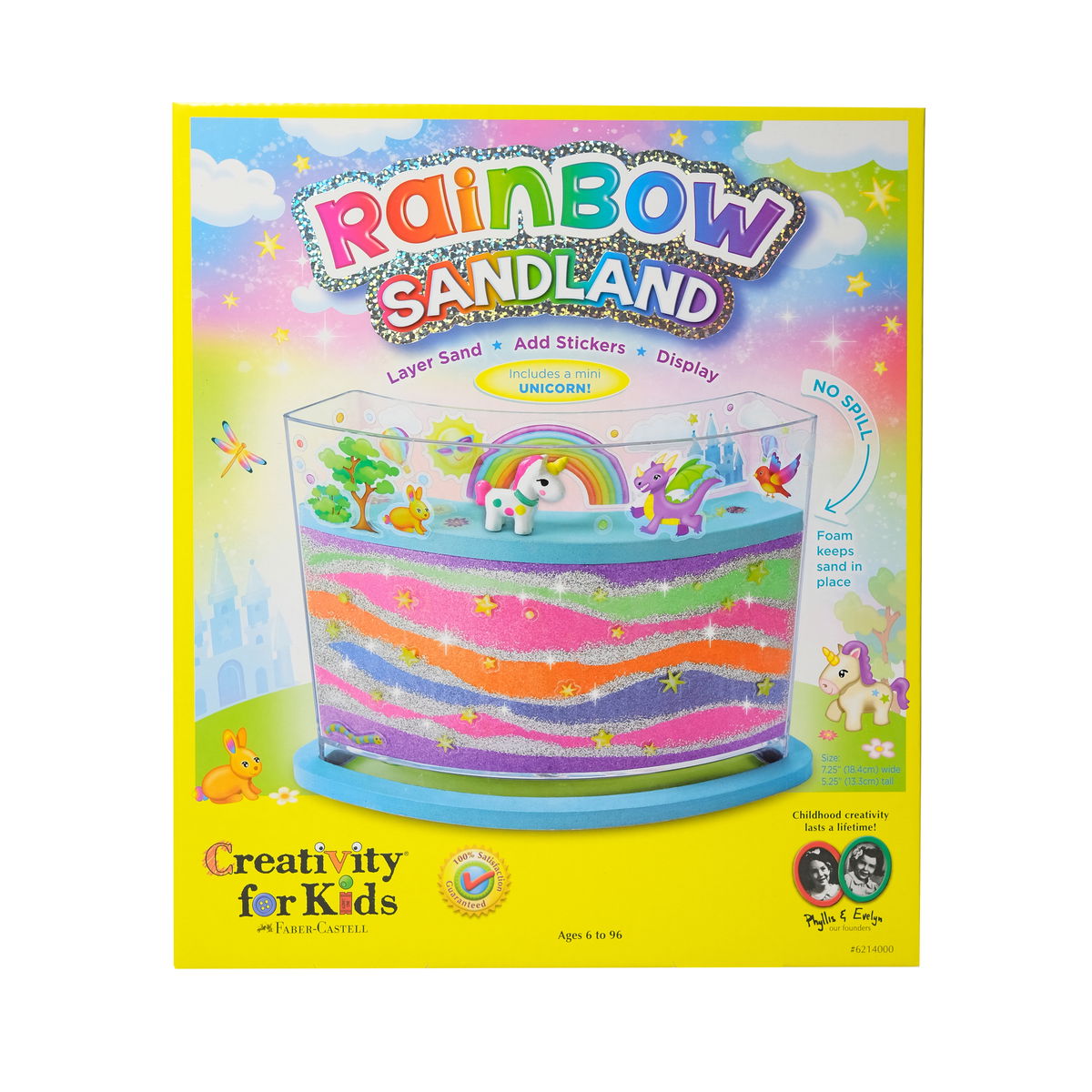Layer vibrant sand and glitter to craft your own rainbow unicorn world