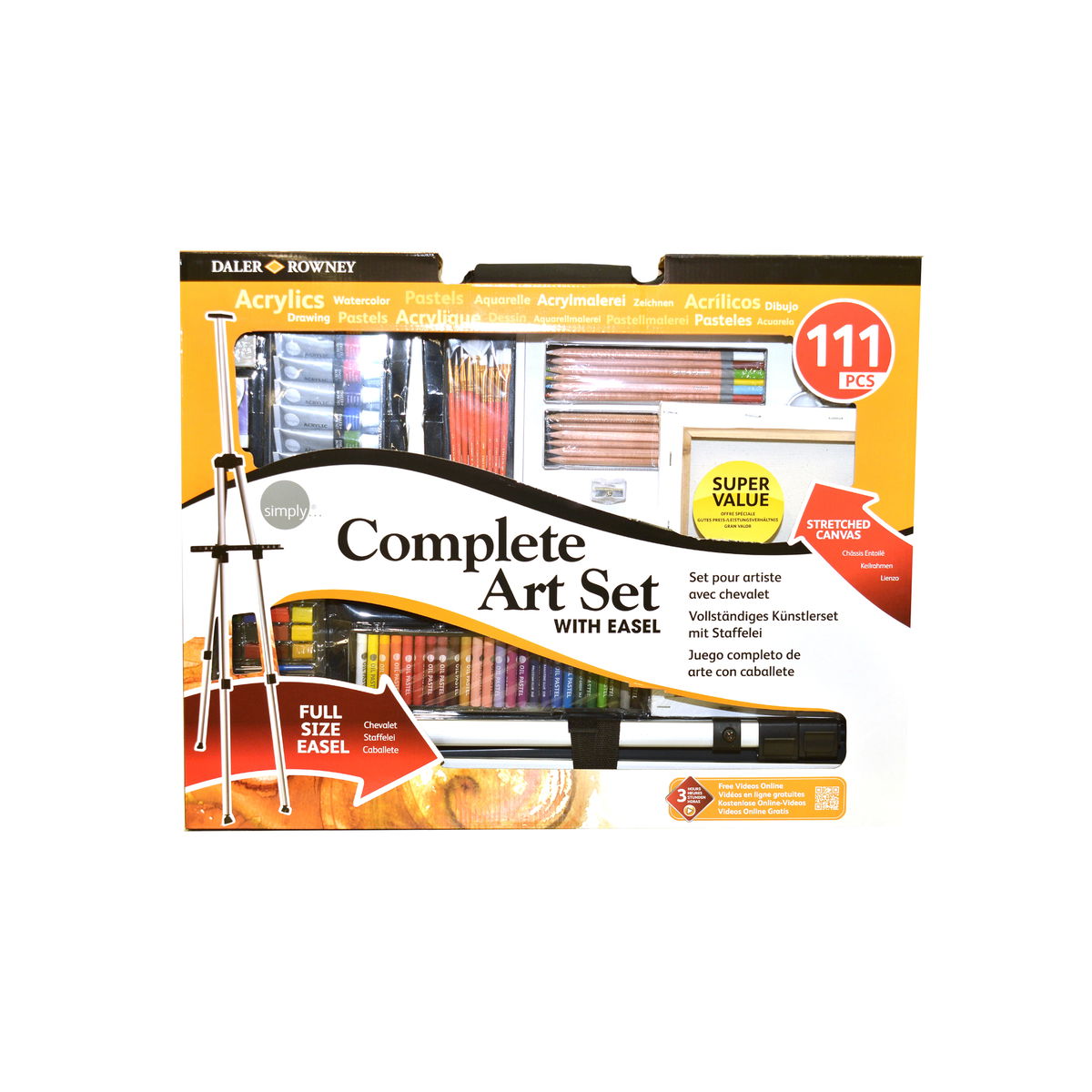 A complete set of everything you need to get started as an artist, the Daler-Rowney Complete Art Set packages together a wide assortment of high quality artist tools (a $130 value) into a convenient set that is easy to carry by its handle. Paint anywhere with the Complete Art Set s included aluminum travel easel that extends up to 65 inches, and its large black nylon carrying case. The Complete Art Set also includes a set of twelve12ml Simply Acrylic paints, a set of oil pastels, a travel watercolor pocket set, brushes of assorted sizes, assorted colored pencils, assorted drawing pencils, mini watercolor brush, palette knife, pencil sharpener, small black pencil pouch, small mixing pallet, gum eraser, white eraser, small stretched canvas, paper sheets, and a color mixing guide.