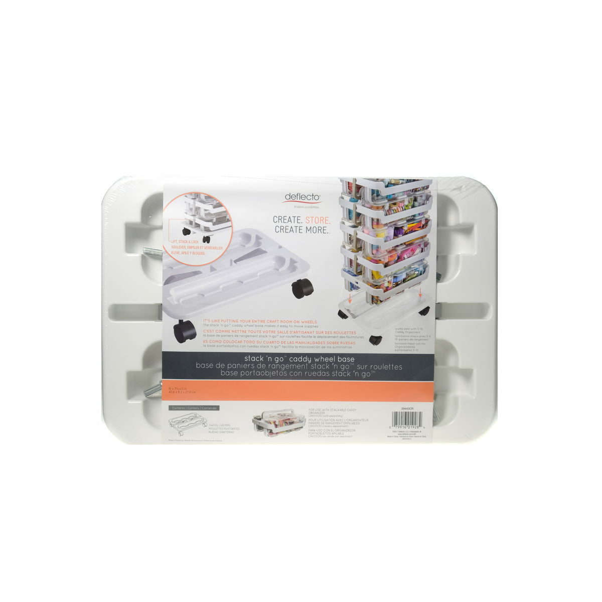 Deflecto s Stack N Go Caddy Wheel Bases makes transporting supplies easier than ever. Its lift and lock lever secures multiple Caddy Organizers to the base with a maximum weight capacity of 150 lbs. Move freely, safely, and easily on both carpet and hard floors with Stack N Go s swivel casters.