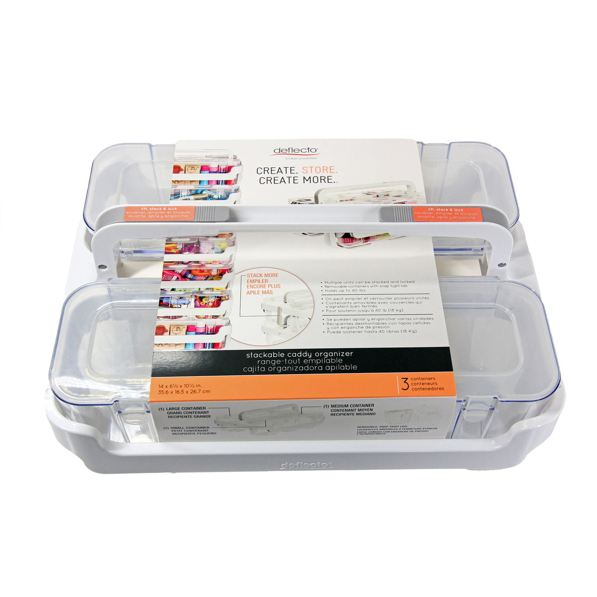 Transform your studio with this compact, portable caddy system. These caddies adapt to meet your organizational needs with interchangeable compartments. Expand your options by purchasing additional Deflecto pieces and stack multiple units neatly with the lift and lock feature. The individual containers are removable, stackable, and offer hinged, snap-tight lids to keep your materials safe and tidy during transport. Supplies are easy to find through the clear container design. Containers measure 4 3/16 in. deep and 4 3/8 in. high and come in three different lengths - 4 3/8 in. (small), 8 in. (medium), and 13 in. (large). This caddy features a white frame and 3 clear containers - 1 small, 1 medium, and 1 large. Explore additional benefits of the Deflecto organization system by adding a Stack 'N Go Caddy Wheel Base or using a wall mount for more storage arrangements.