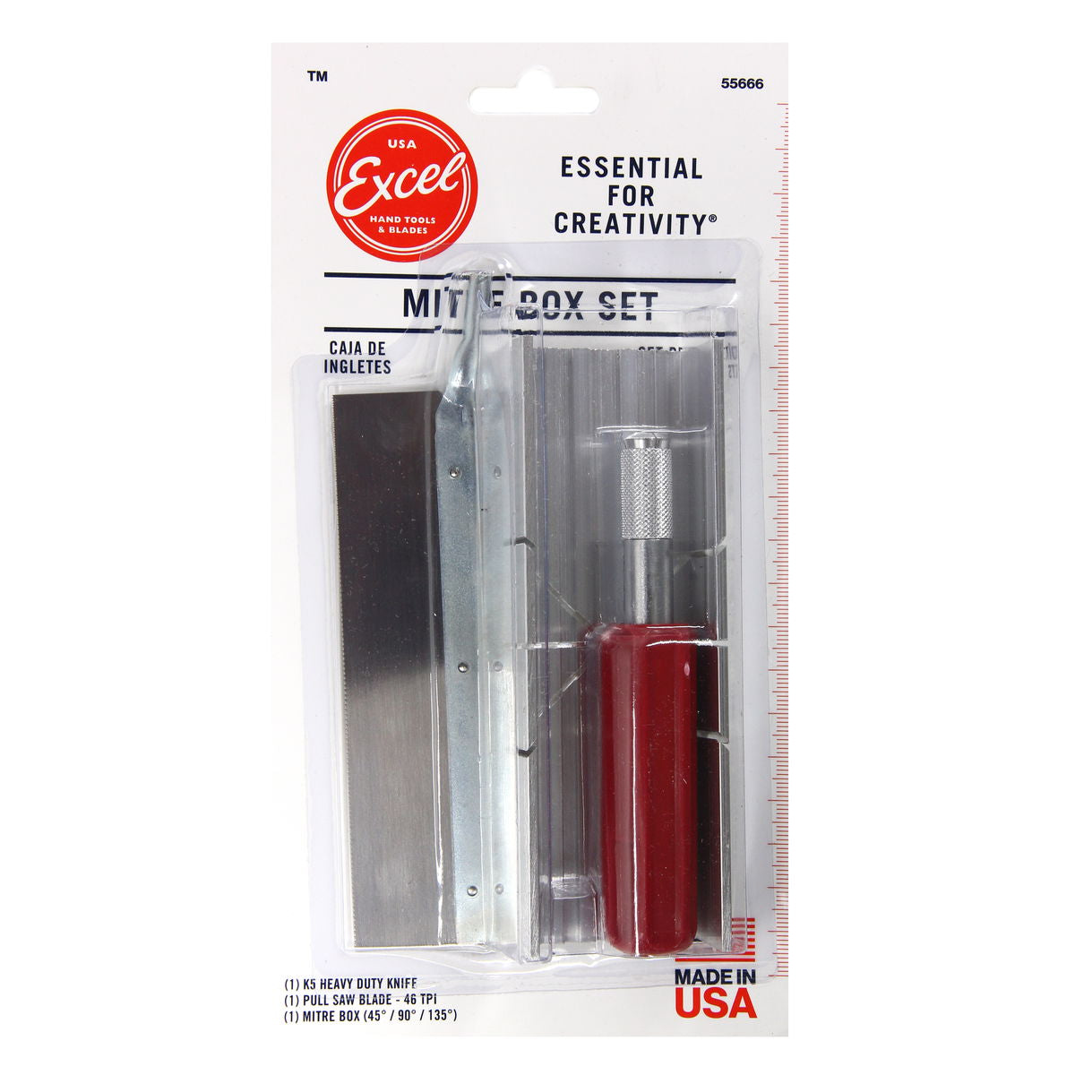 Cut precision mitres with the ProEdge Mitre Box Set. The mitre box has slotted guides for accurate cutting (two 45 degree and one 90 degree) and a grooved base to keep materials securely in place. The box measures 5 1/4 in. x 1 3/4 in. x 3/4 in. deep. The set includes a razor saw blade measuring 5 in. x 1 1/4 in. and a detachable handle that features a four-jaw chuck for extra holding power and quick blade release.