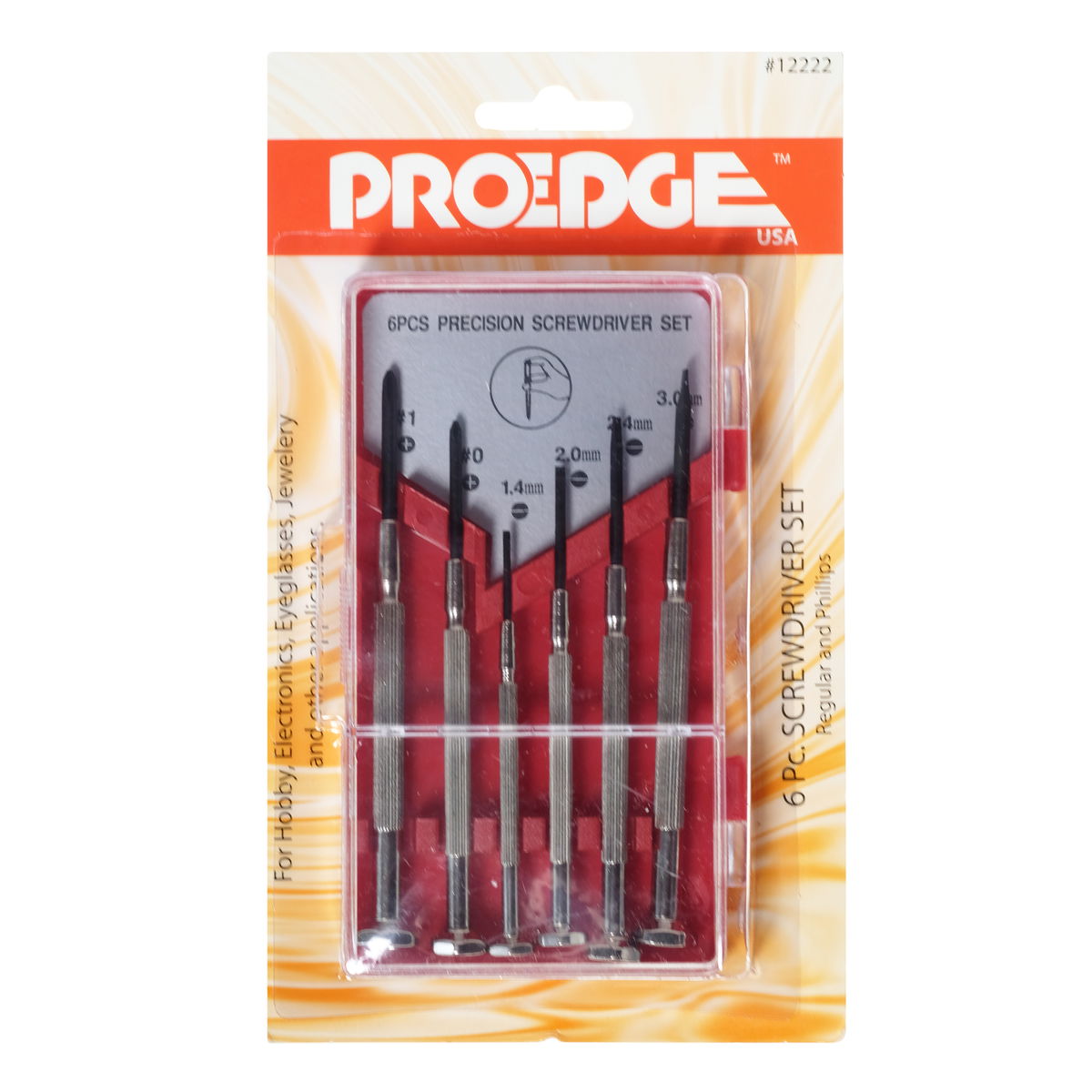 This set contains six precision screwdrivers two Phillips head and four flat head. Phillips head screwdrivers are size 1 and 0. Flat head screwdrivers are 1.4 mm, 1.8 mm, 2.4 mm, and 3.0 mm. The screwdrivers come in a plastic storage case with transparent, snap-tight cover.