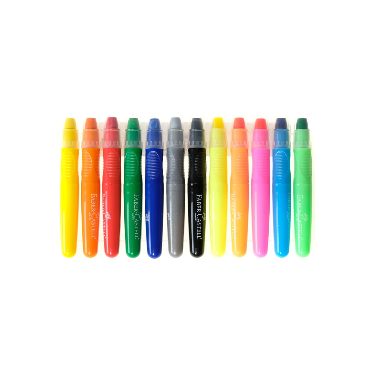 Soft, buttery, easy to blend and smudge! These Gel Crayons glide effortlessly on paper, glass and mirrors, yet wash off easily. They also work great on textured surfaces like wood, watercolor paper and canvas. their chunky size is perfect for small hands. Available in a Set of 12 bright colors: red, yellow, orange, dark blue, grass green, black, silver, neon yellow, neon orange, neon pink, neon blue and neon green. For ages 3+