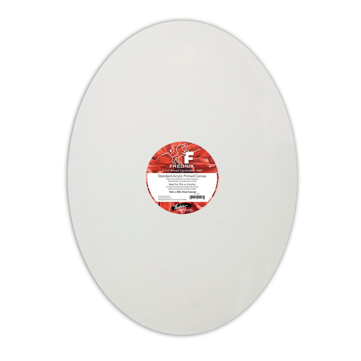 Pre-stretched oval canvas. 100 percent medium texture, acrylic titanium double primed cotton duck. Ready to paint for use with oil or acrylic paints. Popular for fine arts paintings or crafts. 1/2 in. deep. Canvas edges are glued (not stapled) around the edges of the particle board wood frame. Acid free.