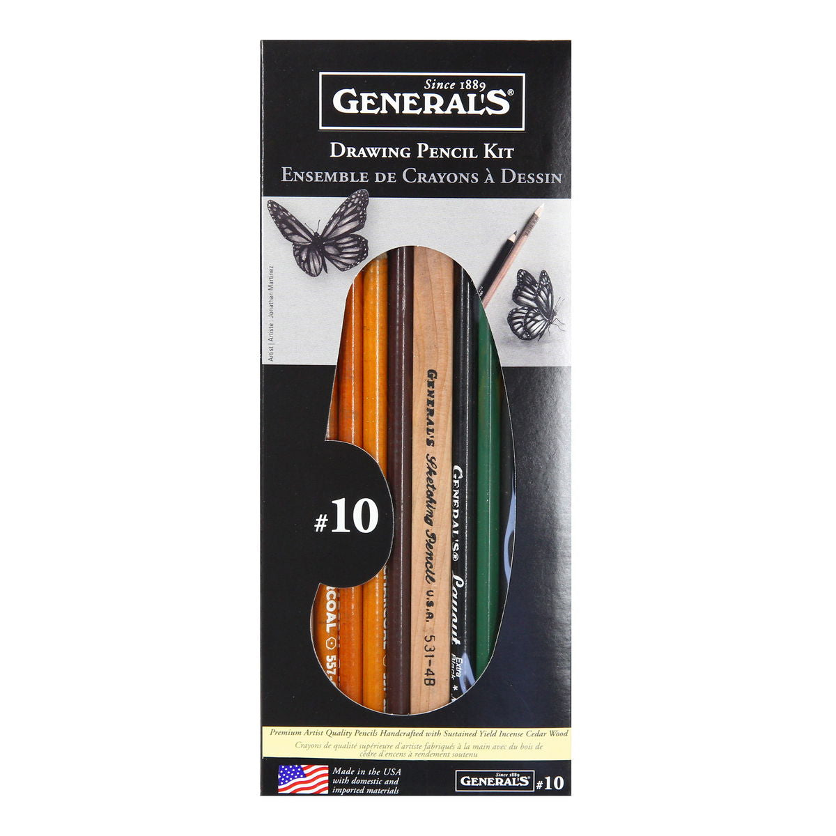 An assortment of popular styles of drawing medium in a handy sketching box containing 12 items: two flat sketching pencils 4B, 6B; three charcoal pencils 2B, 4B, 6B; one Kimberly pencil 6B; two layout pencils; two rectangular and one square graphite sticks 2B,4B,6B; one charcoal white. No. 558.