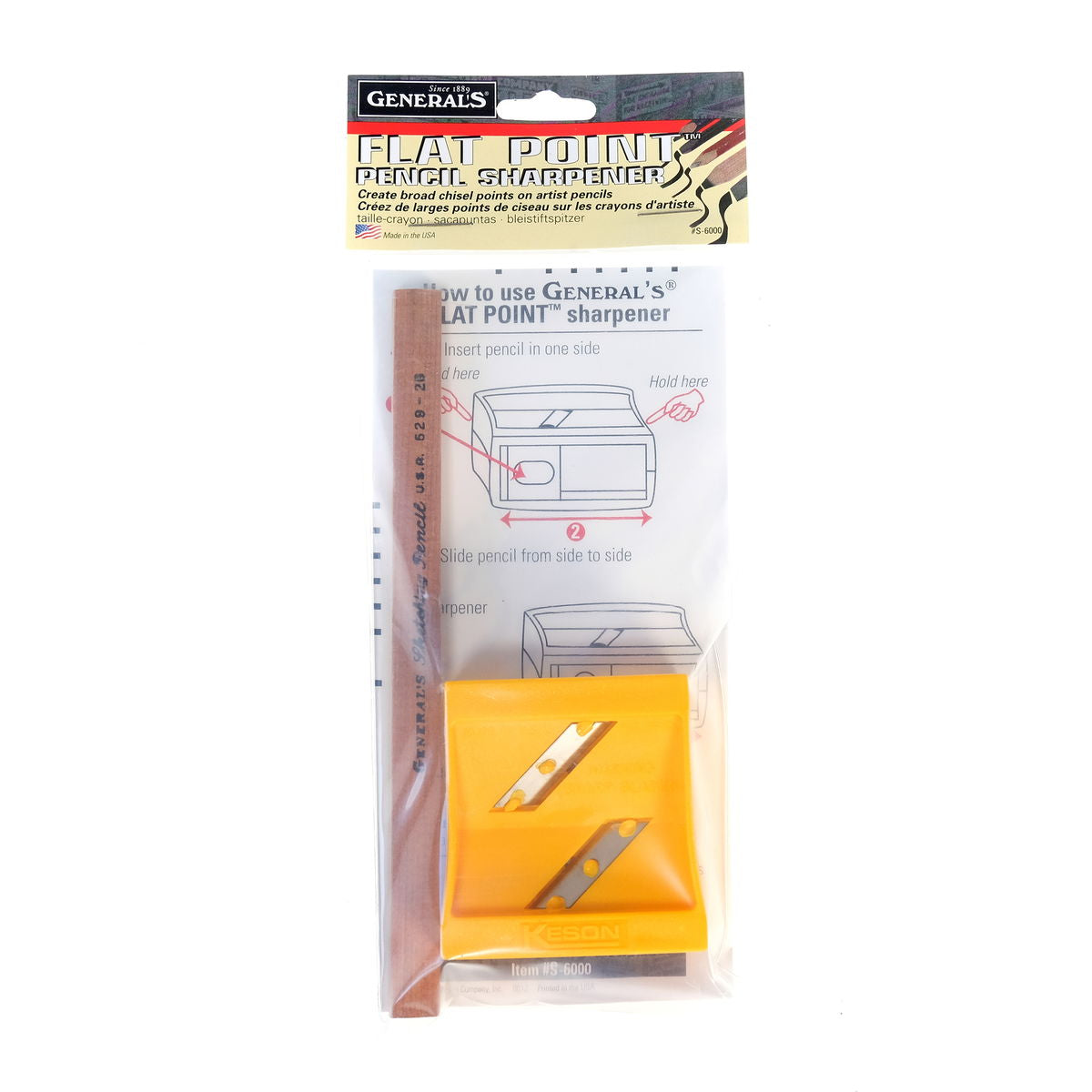 At last, a way to sharpen flat pencils! Excellent for use on all General's flat sketching pencils, carpenter's pencils, oval pencils and woodless graphite. Sharpener produces a chisel point. Pack includes one General's flat sketching pencil.