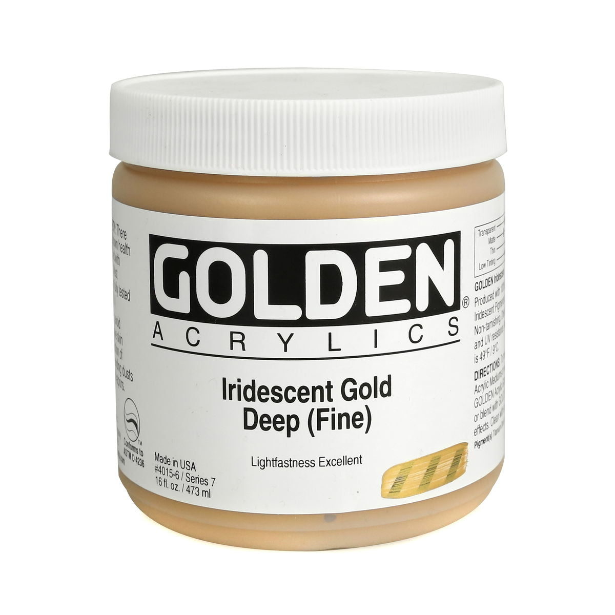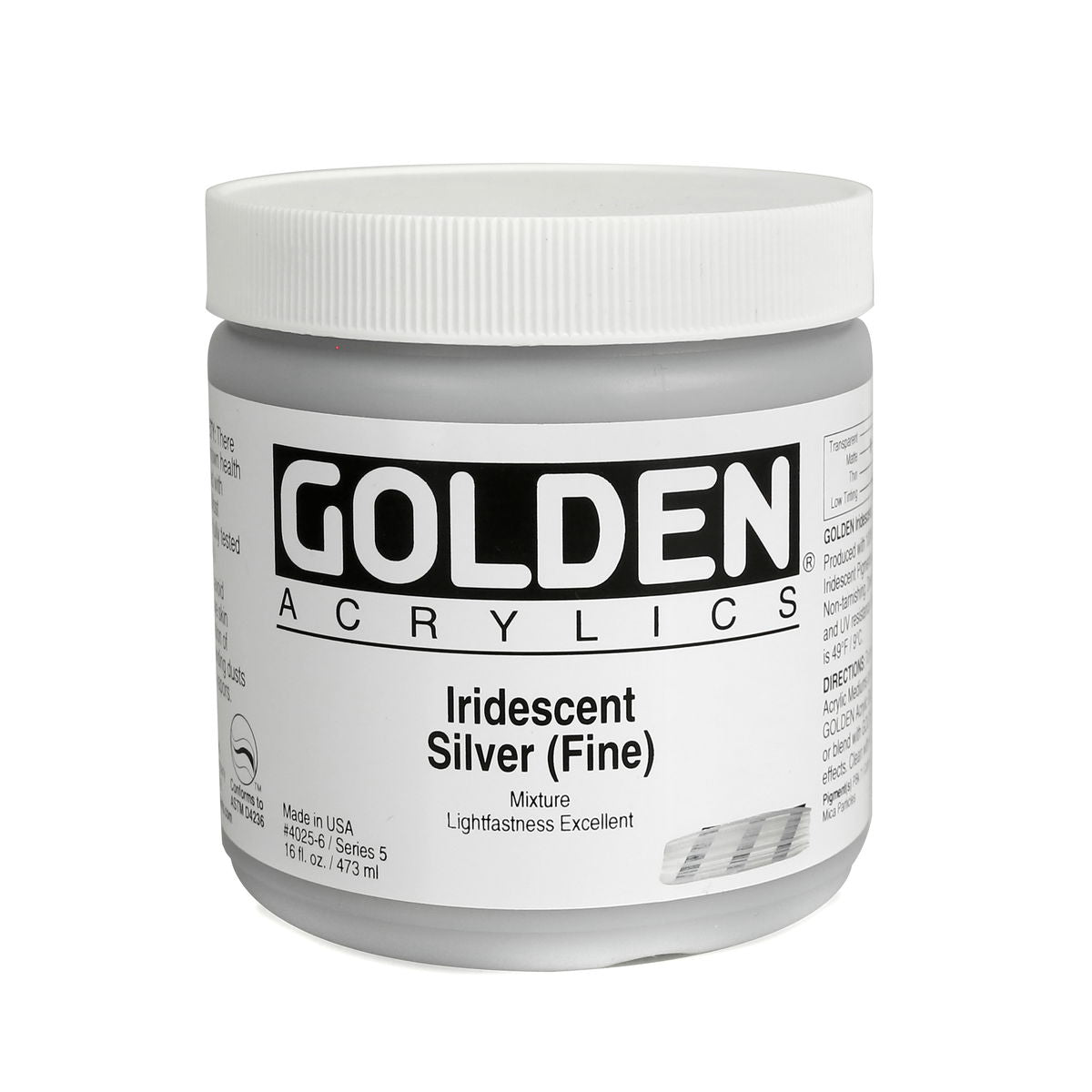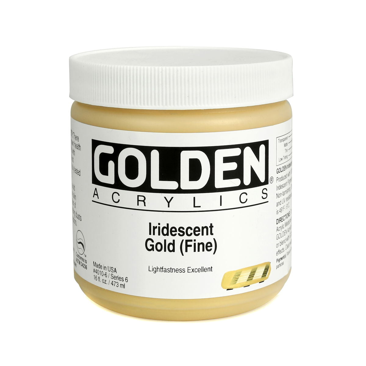 Golden Iridescent Acrylics may be used alone or with other colors, gels and mediums. Iridescent Pearl is extremely useful for mixing with other colors for pearl-like qualities. The Iridescent colors are very resistant to fading and will not oxidize or tarnish. Most Iridescent Acrylics are available in fine and coarse. Coarse Iridescents offer a range of highly reflective pigments including stainless steel and gold mica flakes. Fine Iridescent Colors offer a smooth velvety finish and blend well with other colors. Golden Interference Acrylic Colors offer a unique "interference flip" when viewed from different perspectives. Interference Colors flip between a bright opalescent color and its opalescent complement. When applied over white or lighter surfaces, the Interference Color is less obvious and the "flip" effect is more obvious. When applied over black or darker surfaces, the Interference Color is more obvious and the "flip" effect is less obvious. Adding a very small amount of black to Interference Colors produces deeper opalescent effects. Combine Interference Colors with Golden Gels (Gloss) and Golden Fluid Acrylic colors to produce an endless variety of colors and effects. Most Interference Colors are available in fine or coarse. These Golden Heavy Body Acrylics are produced with 100% Acrylic Polymer Emulsion. This produces a film with excellent flexibility, and chemical, water and UV resistance. The milky emulsion dries transparent, allowing the pigments to show their full color. Pigments are chosen for the greatest purity and permanency within each chemical class.