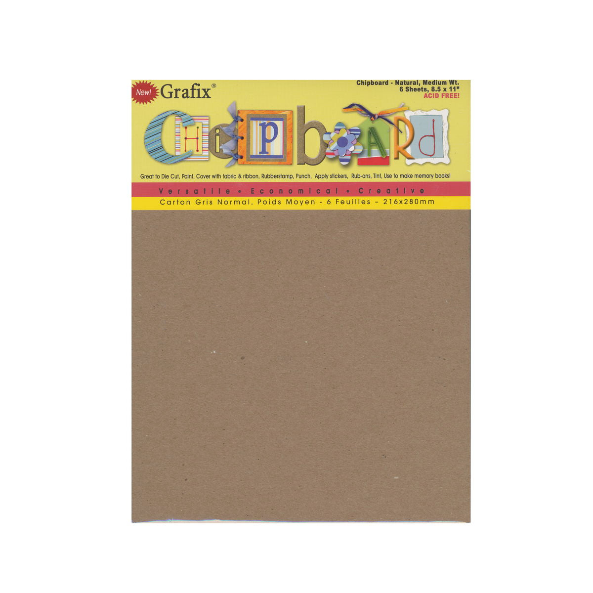 Grafix Chipboard is acid free, and safe to use with photos and keepsakes. This medium weight chipboard is sturdy enough to be painted, tamped and sanded, yet thin enough to be cut by many die cut machines. The chipboard measures 0.057 in. thick. Available in packages of 6 sheets.