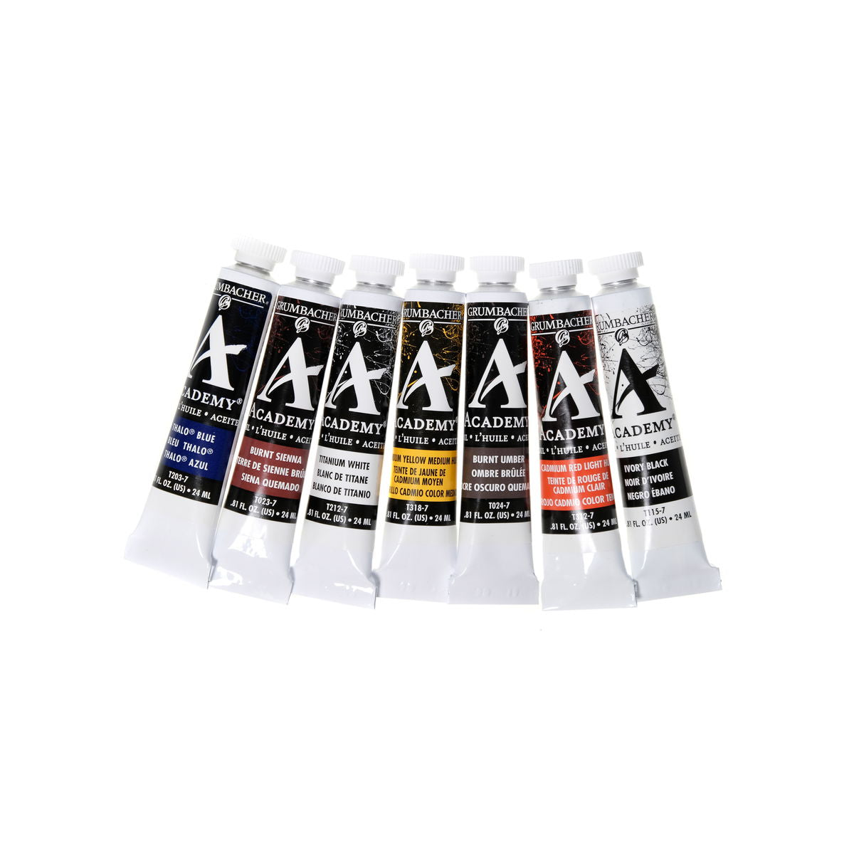The Academy Oil Bonus Set Includes (6) x 24 ml tubes: Cadmium Yellow Medium Hue, Cadmium Red Light Hue, Thalo Blue, Ivory Black, Burnt umber, Burnt Sienna. - Plus (1) FREE 24 ml tube of Titanium White.