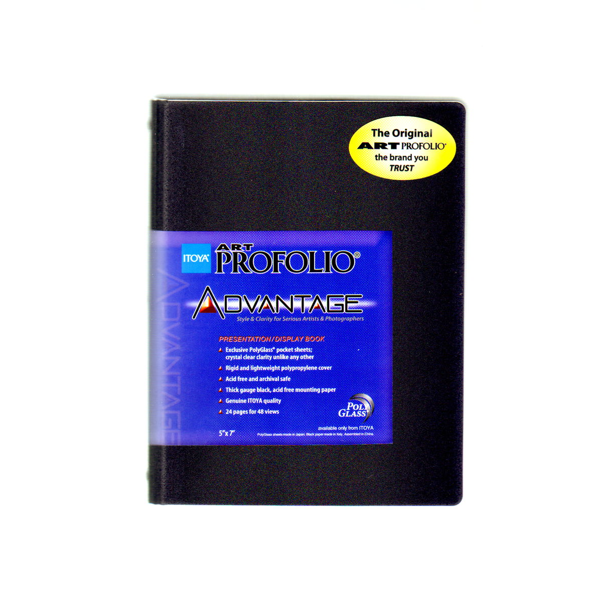 Featuring the Itoya exclusive crystal clear Polyglass pocket sheets, the Advantage line sports a fresh contemporary look for the ultimate understatement in presentation and storage. Using a special polypropylene material incorporated in a rigid, yet lightweight black poly cover for added durability, these books are easily mobile. The multi-fold spine will lie completely flat for presentations and 24 pages allow for 48 inserts. As with all Profolios, the book is acid- free and contains acid-free black mounting paper.