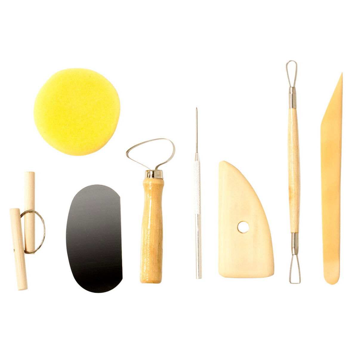 All the basic tools needed to get started in pottery making in a reusable pack! This kit includes a wire clay cutter, sponge, potter's rib, steel scraper, loop tool, ribbon tool, needle tool and wood modeling tool.