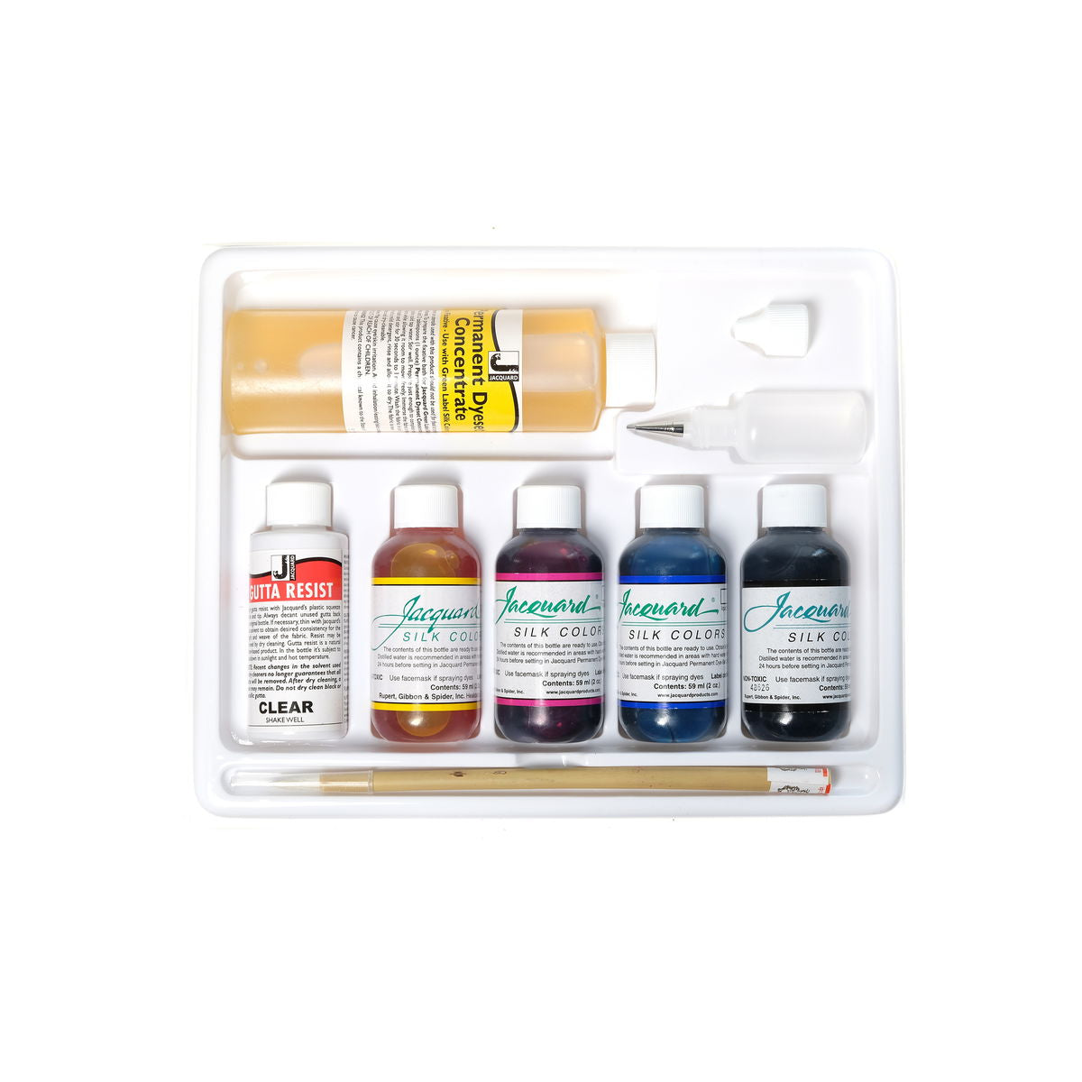 Contains self-fixing, paint-on dyes for silk and wool. Steam fixing of the dyes is not necessary. Painted fabric or garments may be washed or dry-cleaned as usual. The three primary process colors--yellow, magenta, cyan, and black can be intermixed to produce an infinite range of colors. A mixing formula for 20 colors is included in each kit and an easy to read instruction booklet answers most questions about painting on silk. This kit contains four 60 ml bottles of Jacquard Silk Colors (#703-primary yellow, #715-primary magenta, #725-primary blue (cyan), and #759-black), one 200 ml bottle of Permanent Dye set Concentrate, one 60 ml bottle of clear Gutta resist, one Gutta resist dispenser with #7 precision metal nib, one 5/8 in. bamboo brush, and an easy to follow instruction/idea booklet that covers the basics of silk painting. #1770