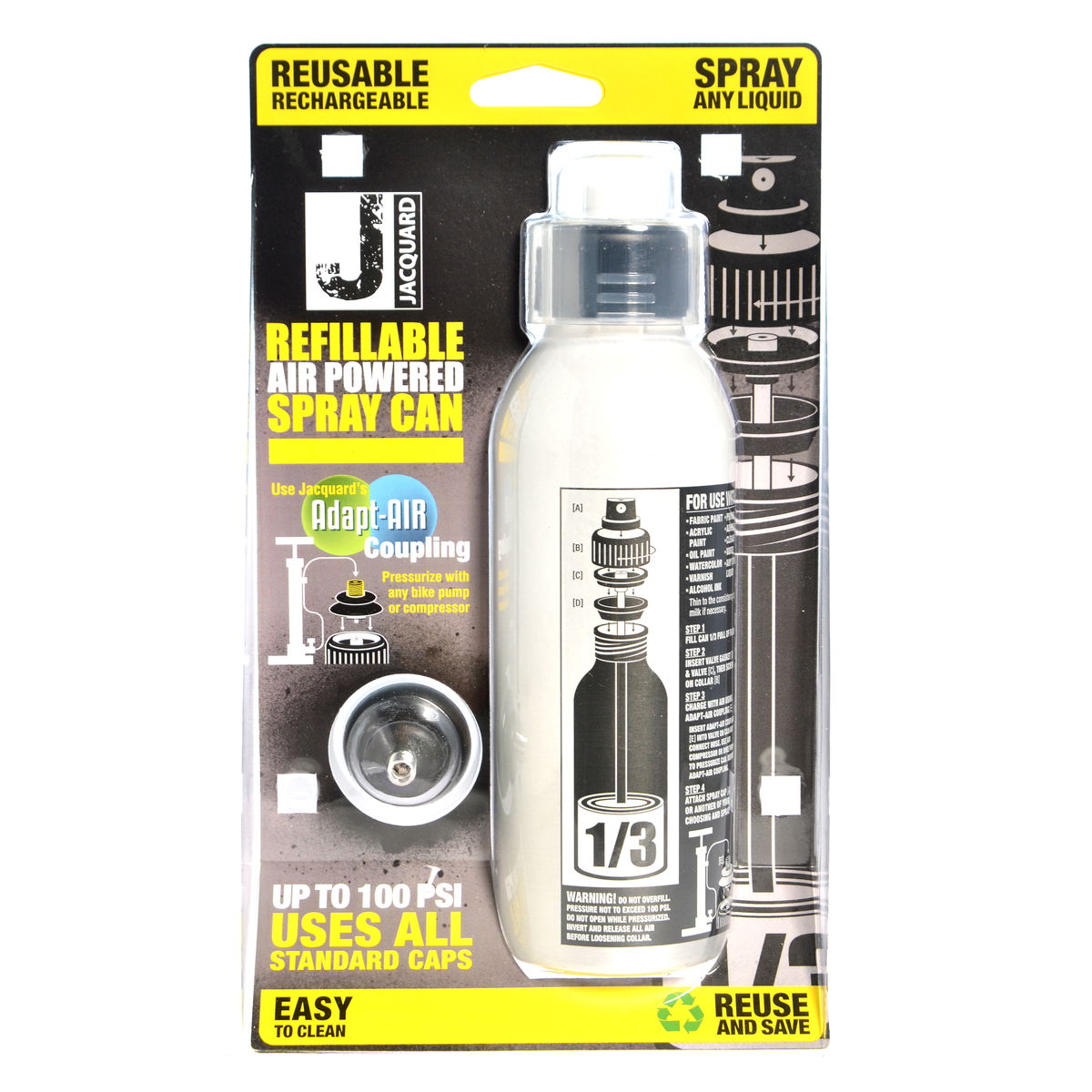 The Jacquard YouCAN is a uniquely refillable air powered spray can that also looks and feels exactly like a regular aerosol can. Fill this distinct spray can with any liquid and use it again, and again, and again! Paints, dyes, inks, adhesives, water, or cleaning solutions; YouCAN spray it all! Use is easy; simply fill YouCAN with your media of choice, pressurize with a bike pump or compressor, and spray! (Do not exceed a pressure of 100 PSI.) YouCAN is environmentally friendly. It contains no propellants or solvents, you won t need to dispose of wasteful empty cans as it is continuously reusable, and there is no odor or fumes. It s special Adapt-Air coupling can be used to rescue leftover material from normal aerosol cans that have lost pressure. Compatable with practically any common cap, provides 1 - 1.5 minutes of continuous spraying.