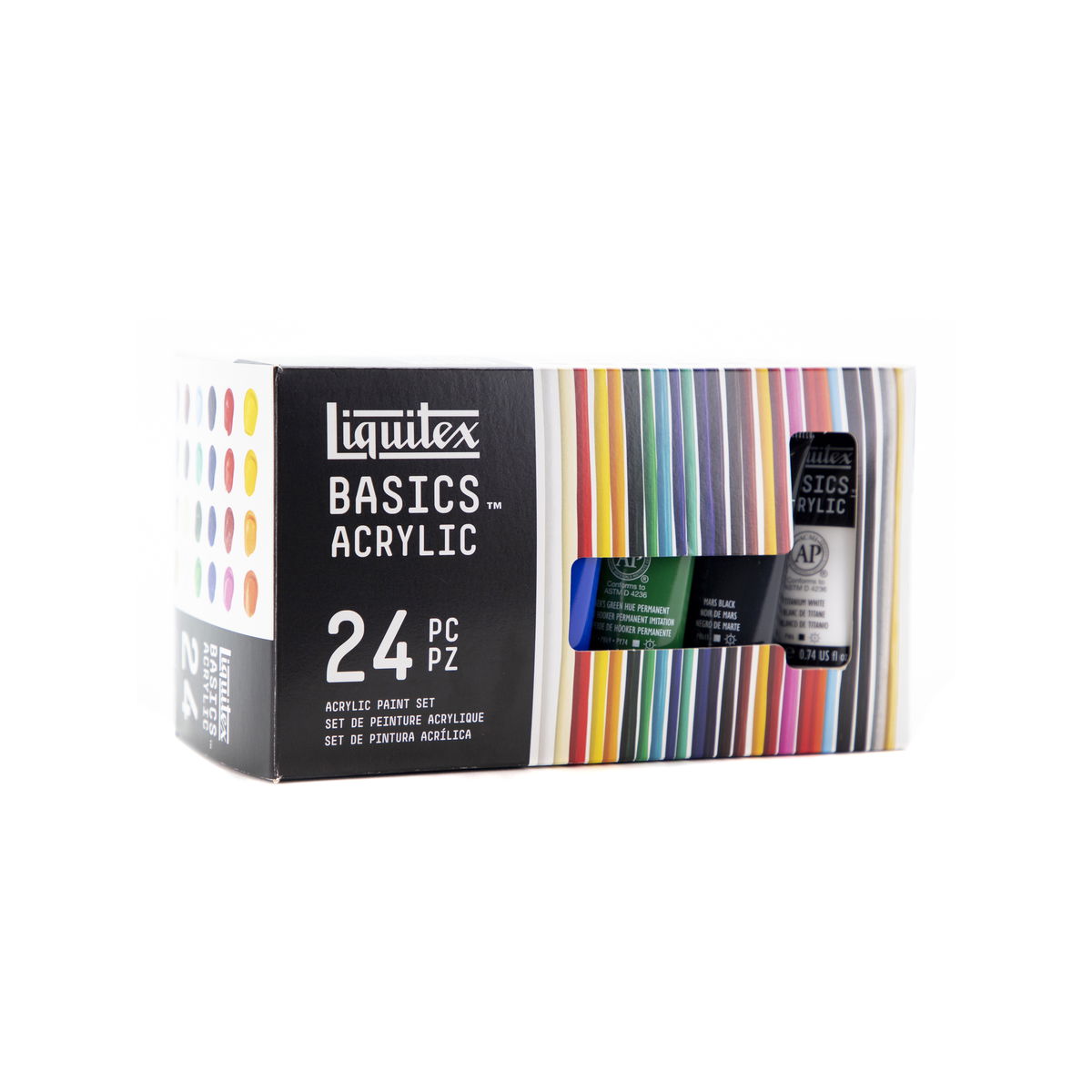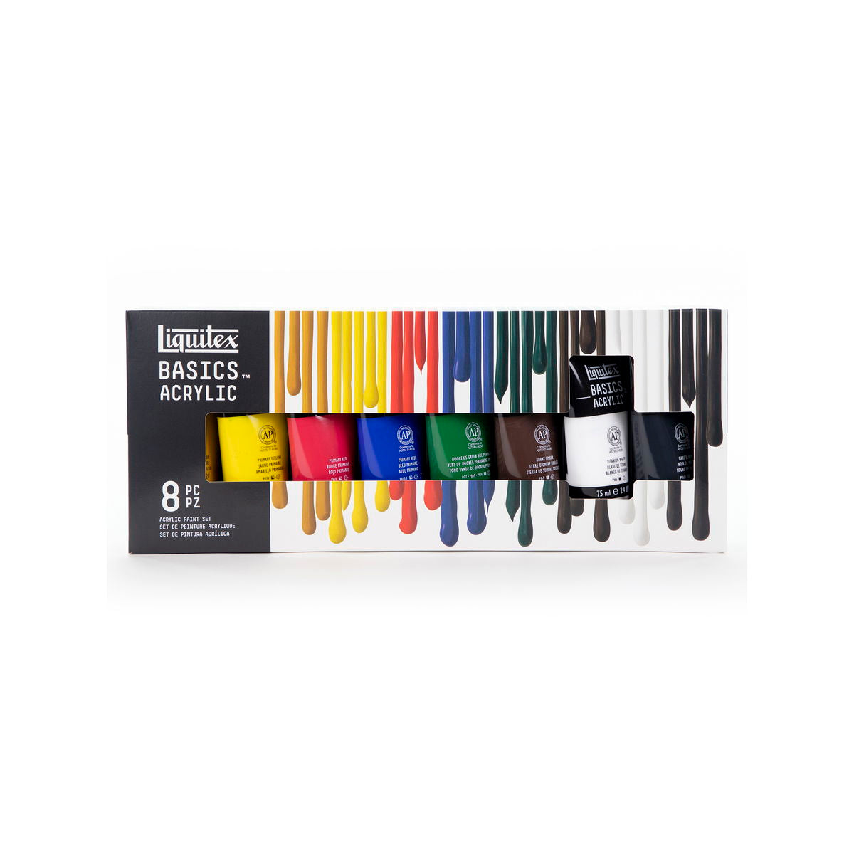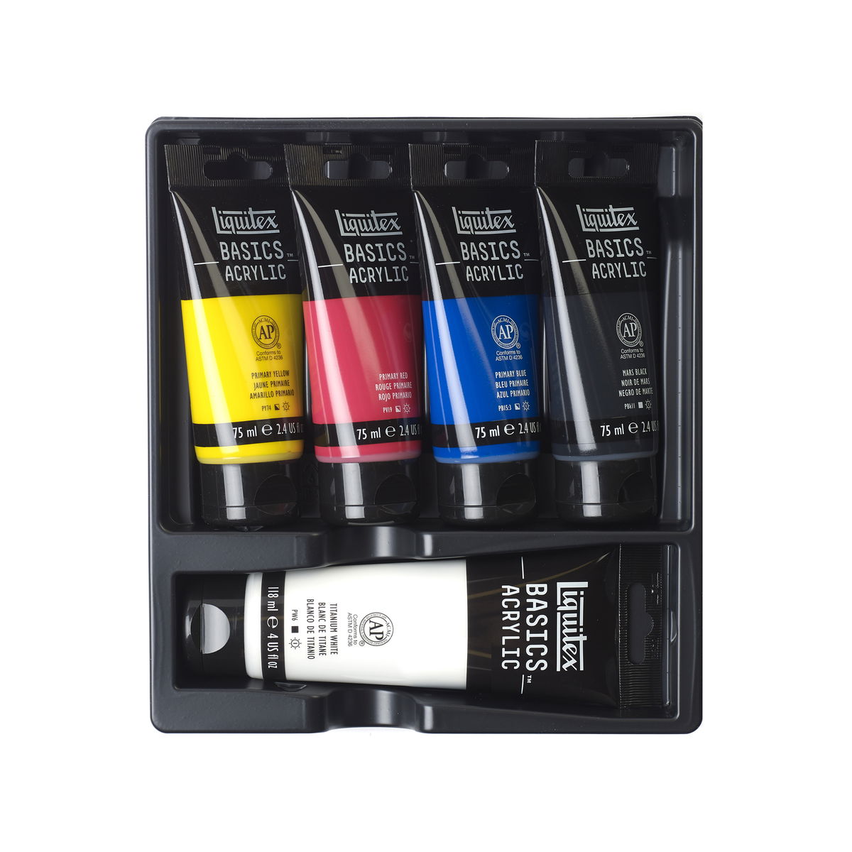 Basics Acrylics are formulated to offer great coverage, outstanding color brilliance, and exceptional brushability. The buttery consistency, medium viscosity, and lightfast fine art pigments make these acrylics perfect for all painting techniques - from watercolor, airbrush, and printmaking to thick applications that simulate oil paints. Water soluble when wet, they are permanent, water resistant, and flexible when dry. 6 X 118ML SET includes primary yellow, mars black, phthalo green, primary blue, primary red, and titanium white. FLUORESCENT SET includes 22ml tubes: fluorescent colors yellow, orange, red, pink, blue, and green. METALLIC & IRIDESCENT SET includes 22ml tubes: metallic gold, metallic silver, metallic bronze, metallic copper, iridescent graphite, and iridescent white. FREE WHITE TUBE SET includes 75ml primary yellow, naphthol crimson, ultramarine blue, mars black, and a bonus free tube of titanium white. 8 X 75ML SET includes primary red, primary yellow, primary blue. hookers green hue, yellow oxide, burnt umber, mars black, and titanium white. 4X75ML and 1X118ML SET includes 75ml tubes primary red, primary blue, primary yellow, and mars black. Plus one 118ml tube of titanium white. STARTER BOX ASSORTED SET includes 1 each 75ml primary red, primary blue, primary yellow, hooker s green hue permanent, burnt umber, yellow oxide, mars black, and 2 each 75 ml titanium white. Also includes 1 BASICS 6 short handle brush pack, color chart, and reusable box. WET on WET TECHNIQUE SET includes 1 each 75ml primary red, primary blue, primary yellow, mars black, and 2 each 75ml titanium white, 1 each 100ml professional slow-dri blending medium, and 1 basics brush. BLENDING TEXTURE TECHNIQUE SET includes 1 each 75ml primary red, primary blue, primary yellow, mars black, and 2 each 75ml titanium white, 1 each 100ml professional modeling paste, palette knife, and educational booklet. 6 X 22ML SET includes primary yellow, primary red, phthalocyanine green, primary blue, mars black, and titanium white. 12 X 22ML SET includes alizarin crimson hue permanent, primary red, cadmium orange hue, burnt sienna, burnt umber, primary yellow, light green permanent, phthalocyanine green, primary blue, dioxazine purple, ivory black, and titanium white. BEST SELLERS SET of 24 X 22ML includes primary yellow, cadmium yellow medium hue, cadmium yellow deep hue, cadmium orange hue, cadmium red medium hue, naphthol crimson, cadmium red deep hue, medium magenta, dioxazine purple, ultramarine blue, phthalocyanine blue (green shade), primary blue, light blue permanent, bright aqua green, hooker s green hue permanent, light green permanent, burnt sienna, burnt umber, mars black, ivory black, unbleached titanium, titanium white, silver, and gold. 36 X 22ML SET includes alizarin crimson hue, burnt sienna, burnt umber, cadmium orange hue, dioxazine purple, ivory black, light green permanent, phthalo green, primary blue, primary red, primary yellow, titanium white, cadmium red light hue, cadmium yellow medium hue, cerulean blue hue, cobalt blue hue, hookers green hue permanent, phthalo blue, quinacridone magenta, raw sienna, raw umber, red oxide, ultramarine blue, yellow oxide, bright aqua green, cadmium red deep hue, cadmium red medium hue, cadmium yellow deep hue, cadmium yellow light hue, deep green permanent, deep violet, gold, neutral gray value 5, silver, naphthol crimson, and mars black. 48 X 22ML SET includes all the colors of the 36 count set plus: brilliant yellow green, light blue permanent, light portrait pink, bronze, light blue violet, naples yellow hue, unbleached titanium, brilliant purple, bronze yellow, medium magenta, copper, and prism violet. 12 X 118ML SET Contains 12 x 118ml tubes Primary Yellow Cadmium Orange Hue Alizarin Crimson Hue Permanent Primary Red Dioxazine Purple Primary Blue Phthalocyanine Green Light Green Permanent Burnt SIenna Burnt Umber Titanium White Mars Black