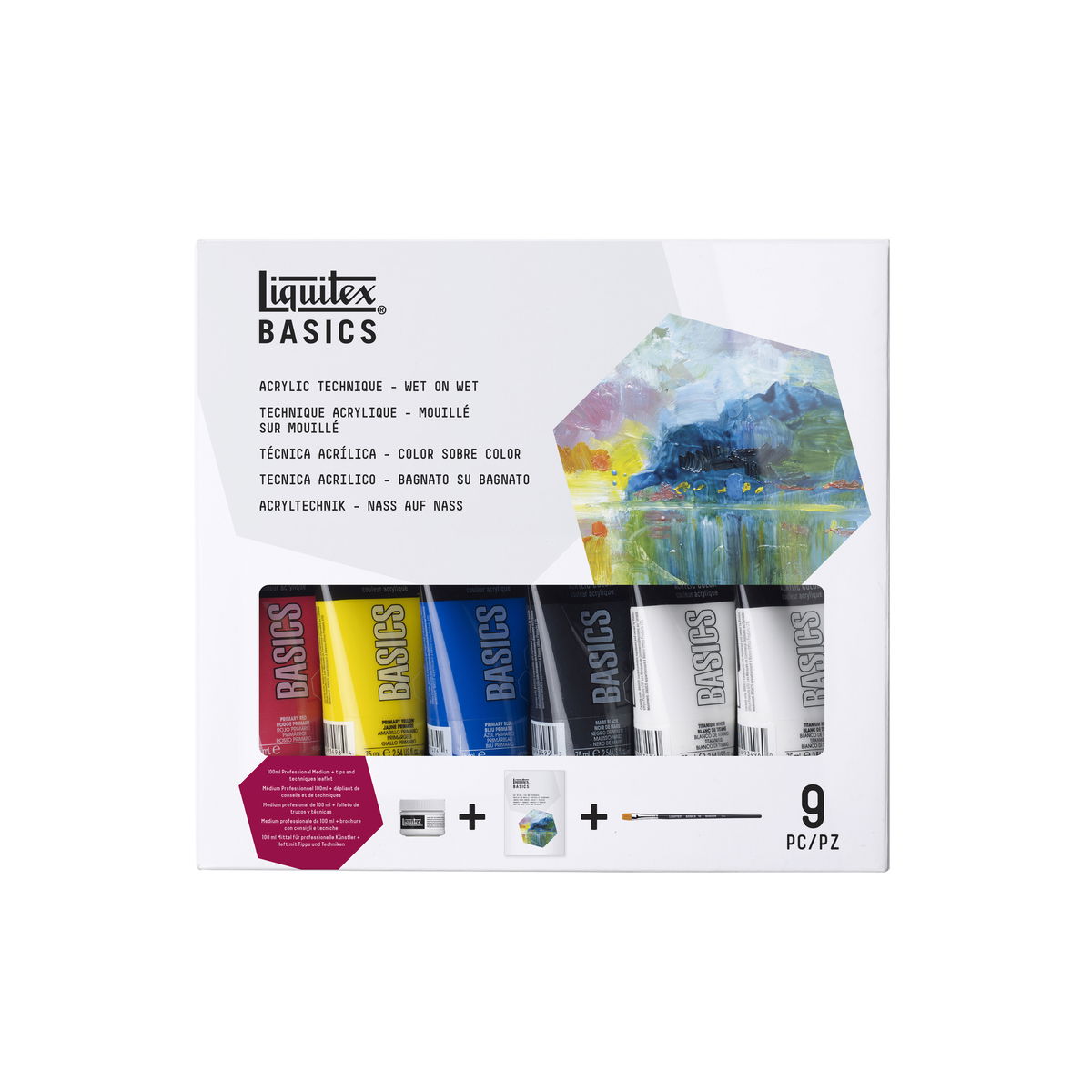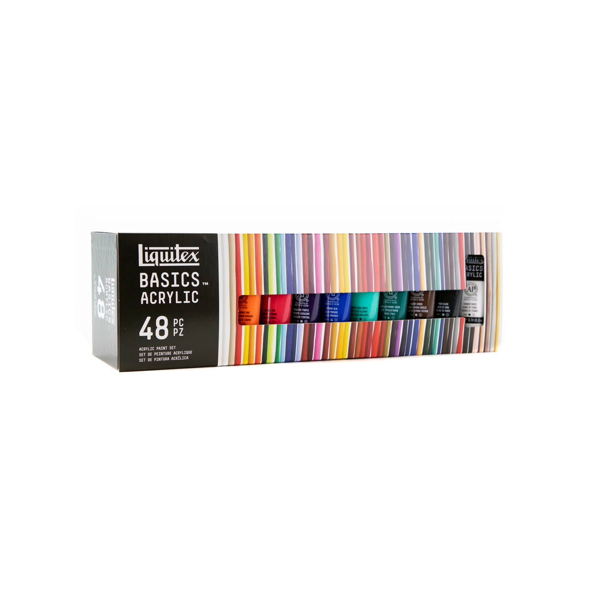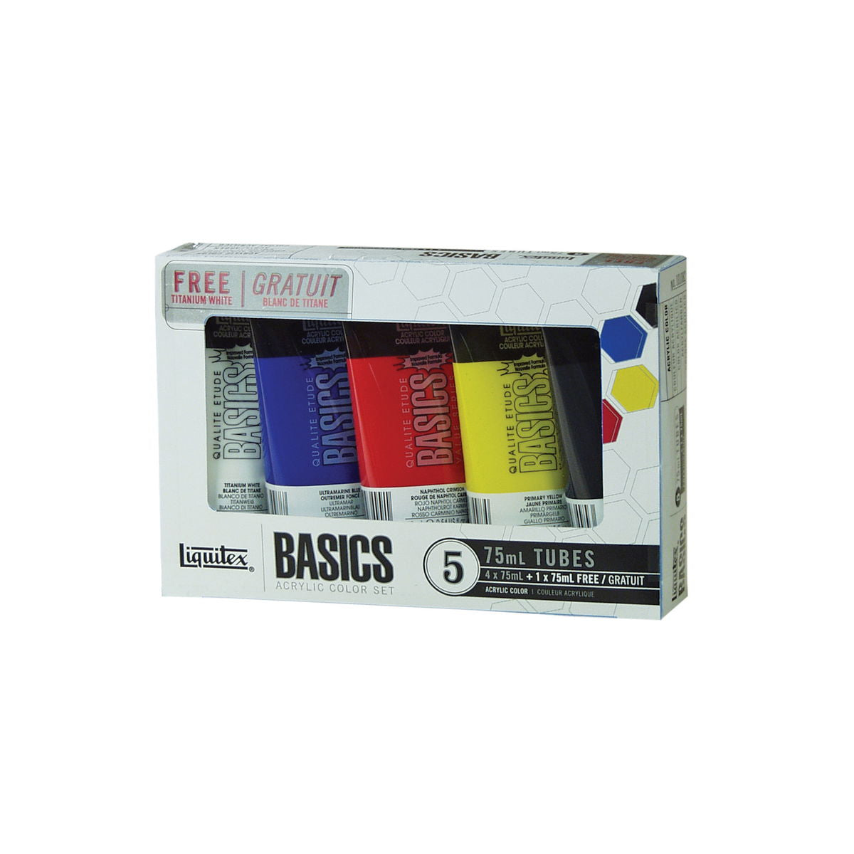 Basics Acrylics are formulated to offer great coverage, outstanding color brilliance, and exceptional brushability. The buttery consistency, medium viscosity, and lightfast fine art pigments make these acrylics perfect for all painting techniques - from watercolor, airbrush, and printmaking to thick applications that simulate oil paints. Water soluble when wet, they are permanent, water resistant, and flexible when dry. 6 X 118ML SET includes primary yellow, mars black, phthalo green, primary blue, primary red, and titanium white. FLUORESCENT SET includes 22ml tubes: fluorescent colors yellow, orange, red, pink, blue, and green. METALLIC & IRIDESCENT SET includes 22ml tubes: metallic gold, metallic silver, metallic bronze, metallic copper, iridescent graphite, and iridescent white. FREE WHITE TUBE SET includes 75ml primary yellow, naphthol crimson, ultramarine blue, mars black, and a bonus free tube of titanium white. 8 X 75ML SET includes primary red, primary yellow, primary blue. hookers green hue, yellow oxide, burnt umber, mars black, and titanium white. 4X75ML and 1X118ML SET includes 75ml tubes primary red, primary blue, primary yellow, and mars black. Plus one 118ml tube of titanium white. STARTER BOX ASSORTED SET includes 1 each 75ml primary red, primary blue, primary yellow, hooker s green hue permanent, burnt umber, yellow oxide, mars black, and 2 each 75 ml titanium white. Also includes 1 BASICS 6 short handle brush pack, color chart, and reusable box. WET on WET TECHNIQUE SET includes 1 each 75ml primary red, primary blue, primary yellow, mars black, and 2 each 75ml titanium white, 1 each 100ml professional slow-dri blending medium, and 1 basics brush. BLENDING TEXTURE TECHNIQUE SET includes 1 each 75ml primary red, primary blue, primary yellow, mars black, and 2 each 75ml titanium white, 1 each 100ml professional modeling paste, palette knife, and educational booklet. 6 X 22ML SET includes primary yellow, primary red, phthalocyanine green, primary blue, mars black, and titanium white. 12 X 22ML SET includes alizarin crimson hue permanent, primary red, cadmium orange hue, burnt sienna, burnt umber, primary yellow, light green permanent, phthalocyanine green, primary blue, dioxazine purple, ivory black, and titanium white. BEST SELLERS SET of 24 X 22ML includes primary yellow, cadmium yellow medium hue, cadmium yellow deep hue, cadmium orange hue, cadmium red medium hue, naphthol crimson, cadmium red deep hue, medium magenta, dioxazine purple, ultramarine blue, phthalocyanine blue (green shade), primary blue, light blue permanent, bright aqua green, hooker s green hue permanent, light green permanent, burnt sienna, burnt umber, mars black, ivory black, unbleached titanium, titanium white, silver, and gold. 36 X 22ML SET includes alizarin crimson hue, burnt sienna, burnt umber, cadmium orange hue, dioxazine purple, ivory black, light green permanent, phthalo green, primary blue, primary red, primary yellow, titanium white, cadmium red light hue, cadmium yellow medium hue, cerulean blue hue, cobalt blue hue, hookers green hue permanent, phthalo blue, quinacridone magenta, raw sienna, raw umber, red oxide, ultramarine blue, yellow oxide, bright aqua green, cadmium red deep hue, cadmium red medium hue, cadmium yellow deep hue, cadmium yellow light hue, deep green permanent, deep violet, gold, neutral gray value 5, silver, naphthol crimson, and mars black. 48 X 22ML SET includes all the colors of the 36 count set plus: brilliant yellow green, light blue permanent, light portrait pink, bronze, light blue violet, naples yellow hue, unbleached titanium, brilliant purple, bronze yellow, medium magenta, copper, and prism violet. 12 X 118ML SET Contains 12 x 118ml tubes Primary Yellow Cadmium Orange Hue Alizarin Crimson Hue Permanent Primary Red Dioxazine Purple Primary Blue Phthalocyanine Green Light Green Permanent Burnt SIenna Burnt Umber Titanium White Mars Black