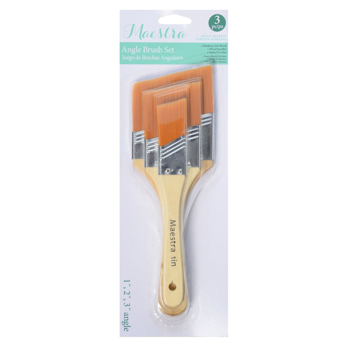 Maestra brushes offer high quality and affordable brushes in convenient sets that give artist the variety of shapes and sizes they need to tackle any project. These brushes are great for hobby, decorative, and artistic painting. The set includes 3 angle brushes with medium soft gold taklon hair. Recommended for acrylics, watercolor, an oil. Great for general painting, washes, glazes, and gesso.