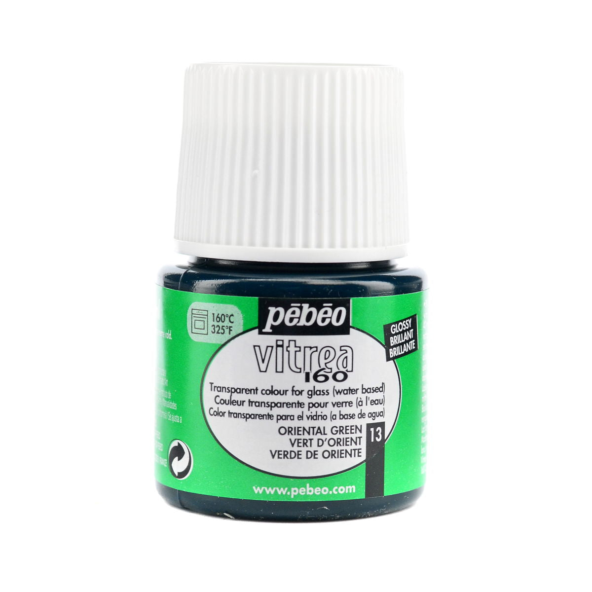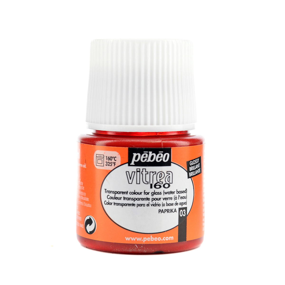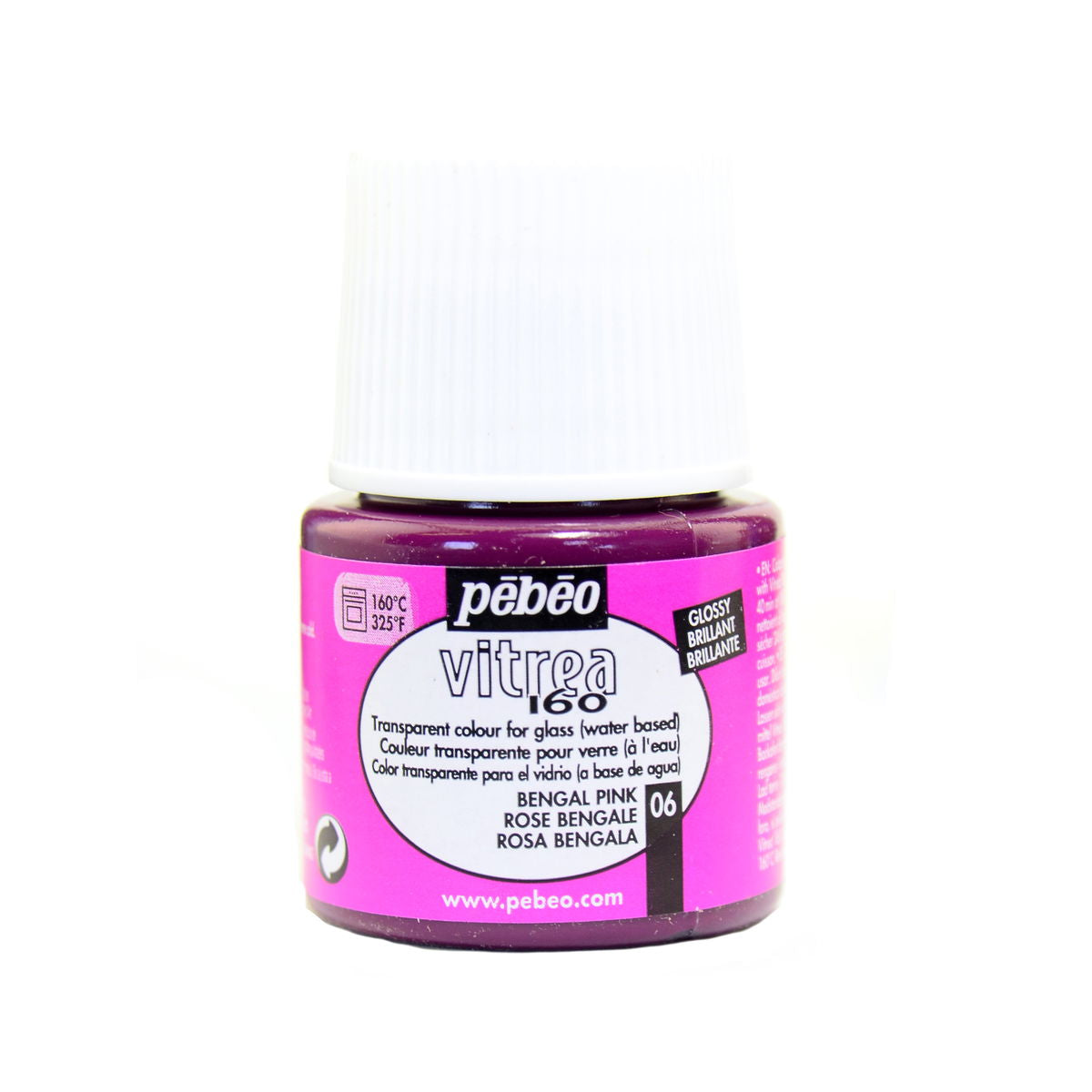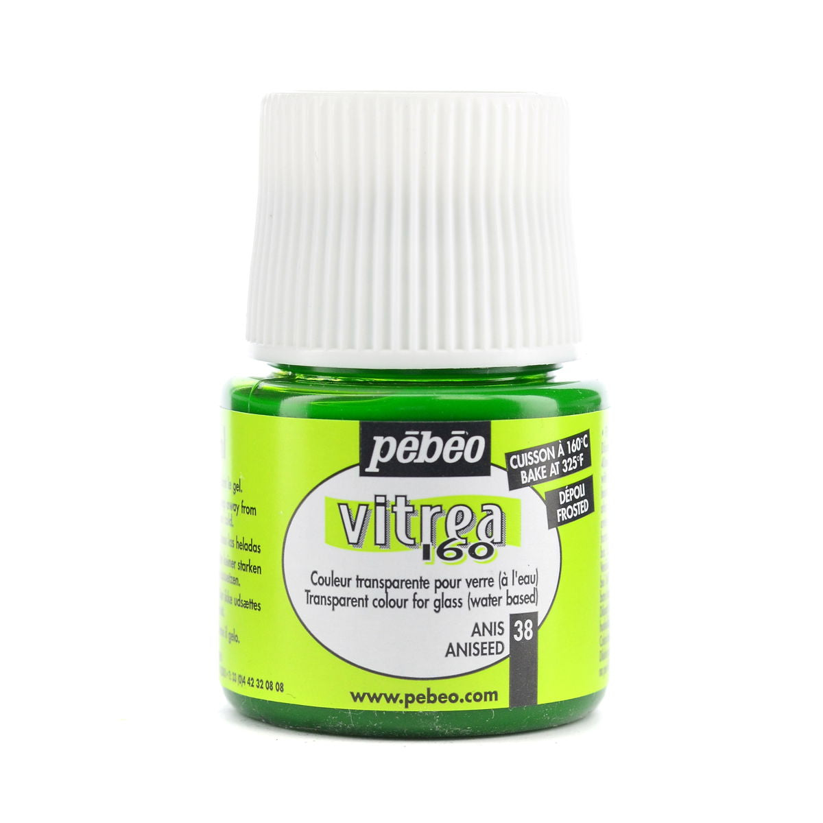 Pebeo Vitrea 160 colors are transparent, water-based paints for use on glass. Use Vitrea 160 glossy or frosted colors to create vivid artwork that gathers gorgeous light. Vitrea 160 colors become dishwasher-safe after baking. Available in 1.5-ounce (45 ml) bottles.
