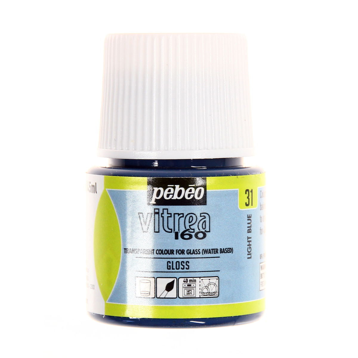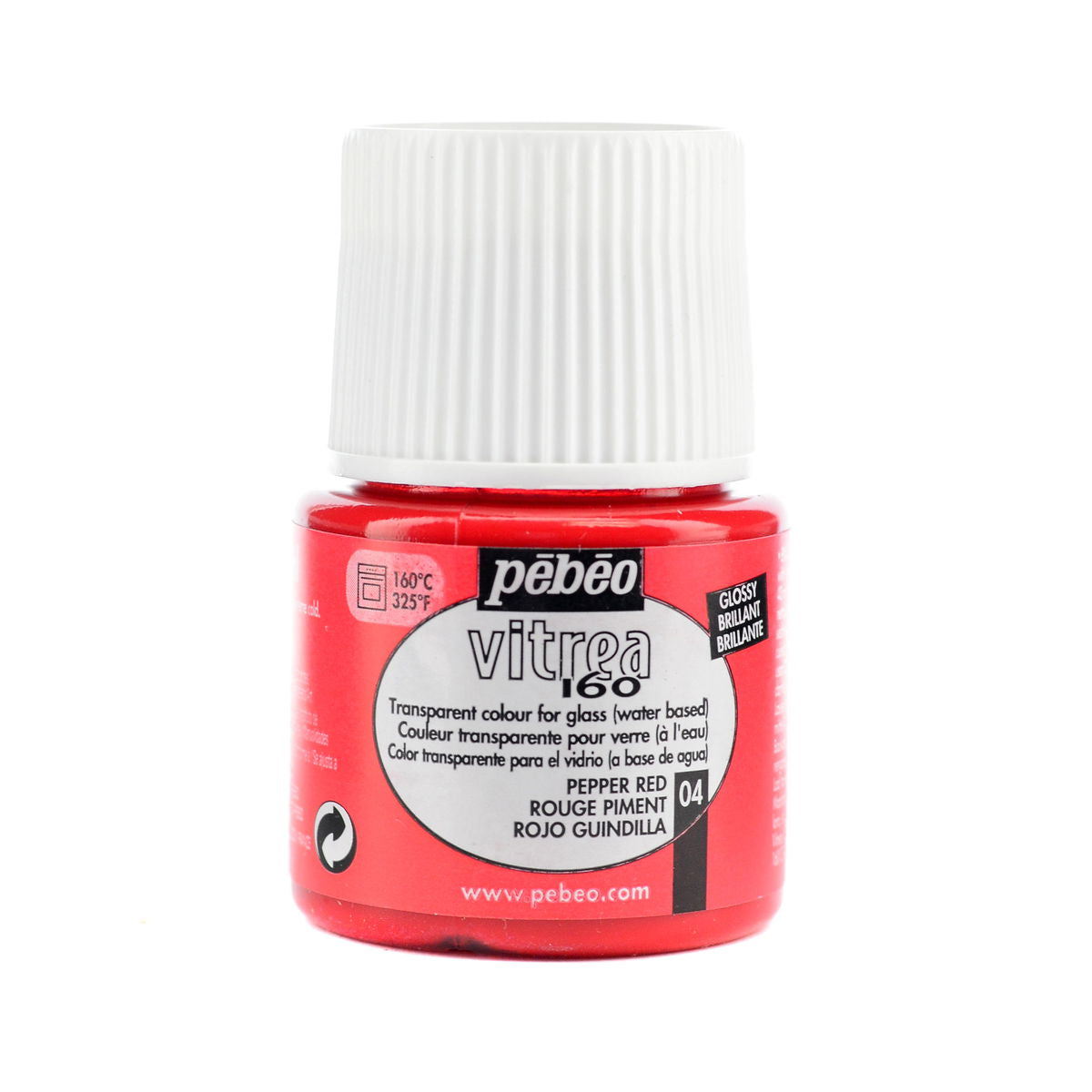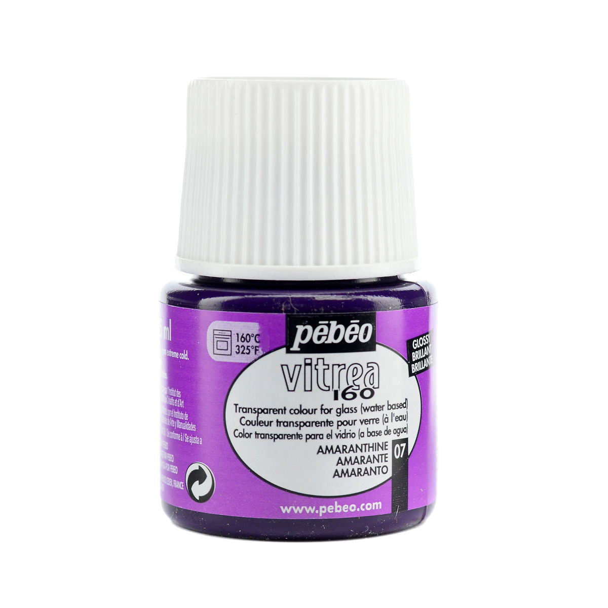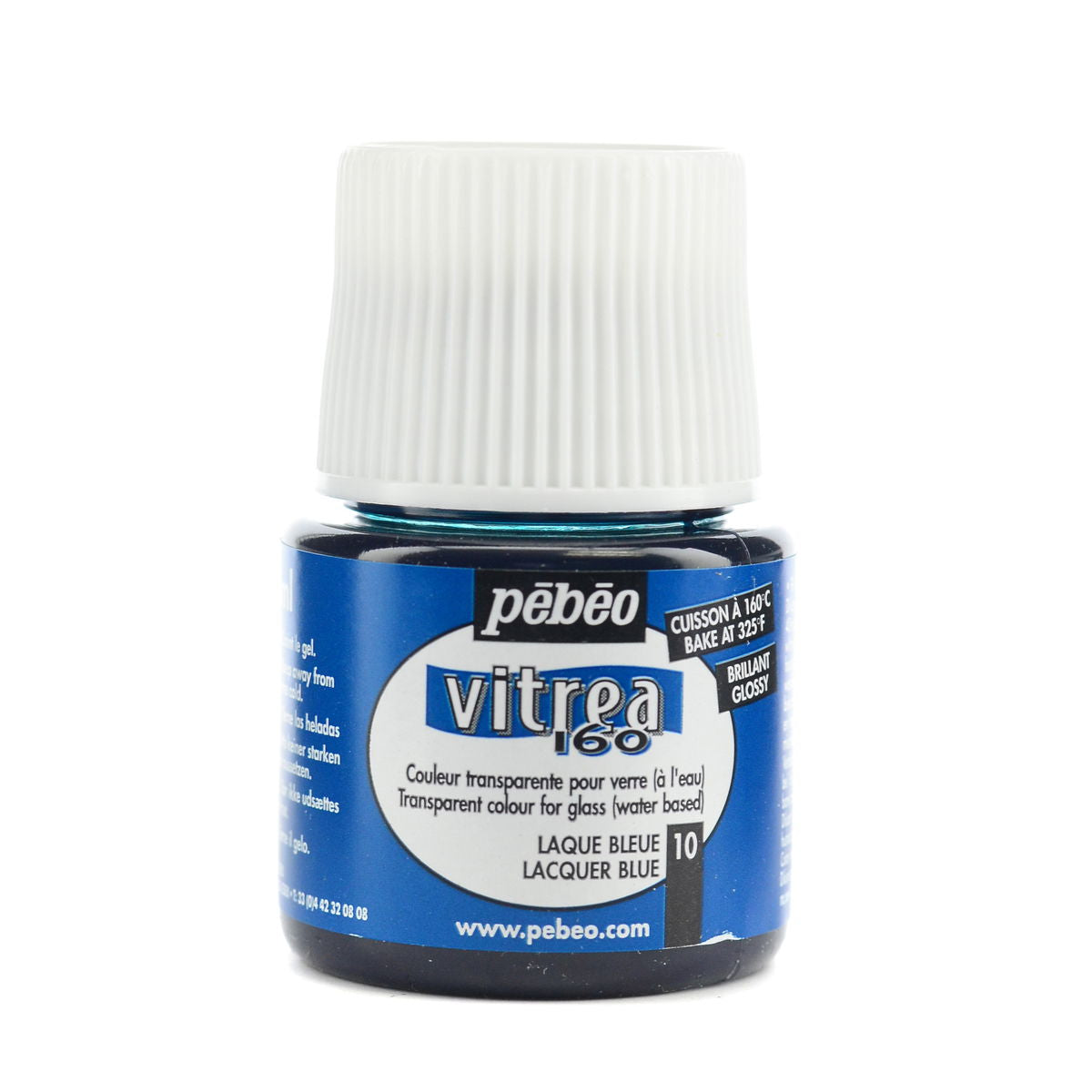 Pebeo Vitrea 160 colors are transparent, water-based paints for use on glass. Use Vitrea 160 glossy or frosted colors to create vivid artwork that gathers gorgeous light. Vitrea 160 colors become dishwasher-safe after baking. Available in 1.5-ounce (45 ml) bottles.