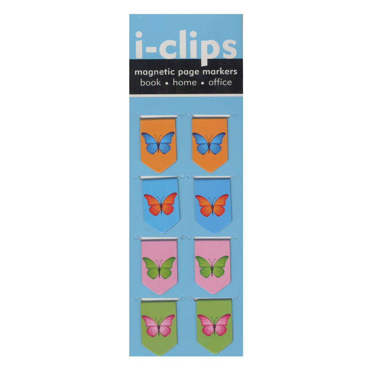 The multipurpose i-clip can be used as a secure bookmark, a fridge magnet, a paper clip and more. Laminated folding magnets feature appealing design themes. Each set of 8 i-clips is packaged in a clear plastic sleeve measuring 2.5 in. x 7 in. Each clip is .75 in. x 1 in.