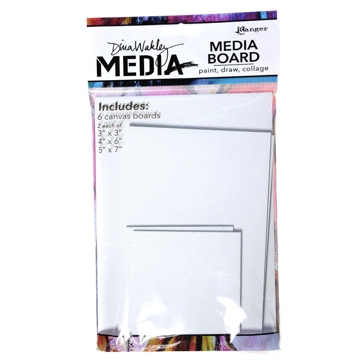 Great for wet media applications, Dina Wakley Media Board is primed white canvas mounted to heavyweight chipboard with a smooth white backing. This new surface accepts a variety of paint, ink and art mediums. Media Board is the ideal mixed media surface to create on. Use with Dina Wakley Heavy Body Acrylic Paint, Mediums & Gesso, stamps, stencils, texture pastes and more. Available in an assorted size pack of 6 boards, 2 each of 3 in. x 3 in., 4 in. x 6 in. and 5 in. x 7 in.