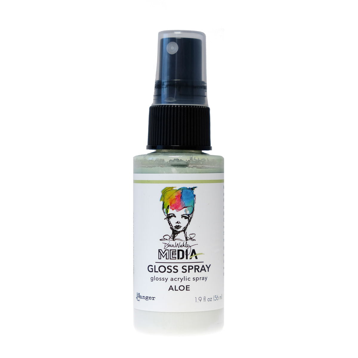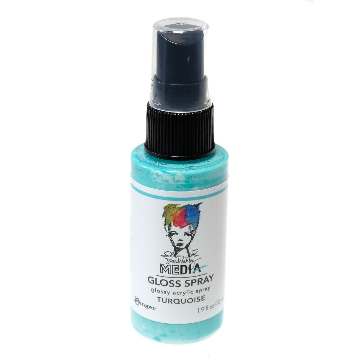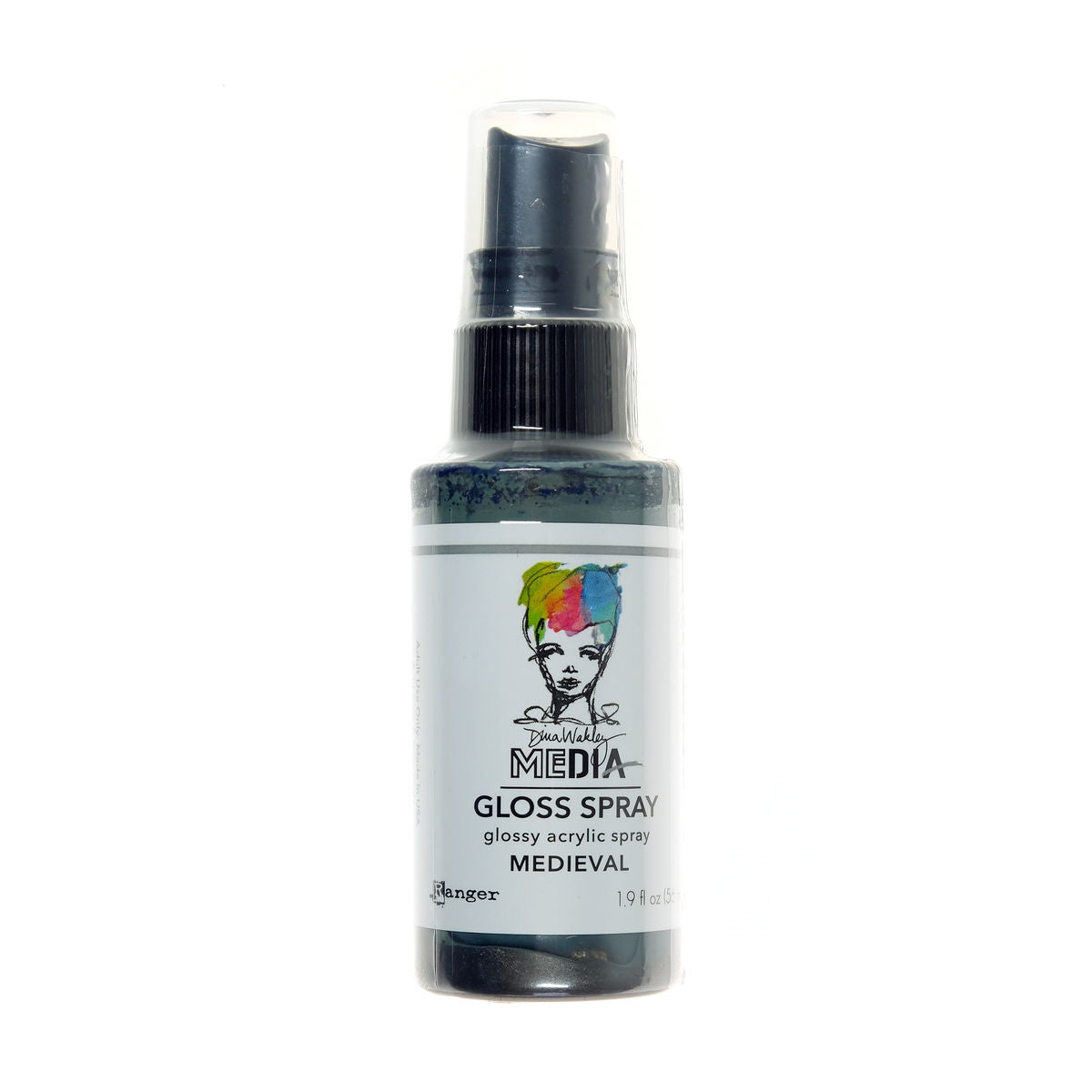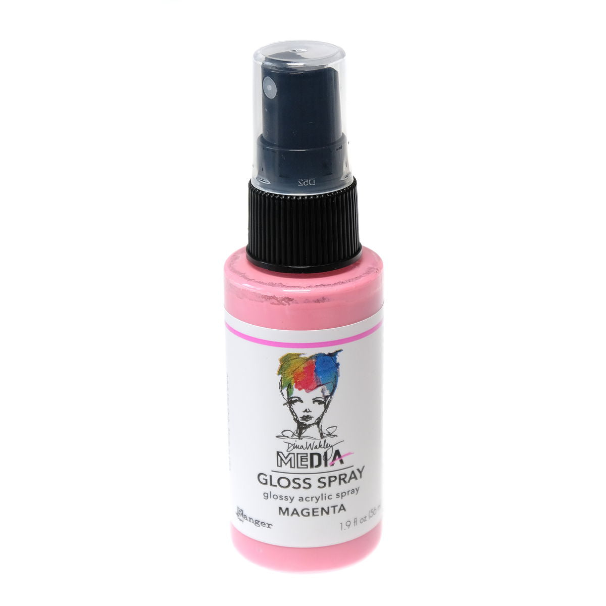 New Dina Wakley MEdia Gloss Spray is an opaque acrylic spray that dries to a glossy finish. Spray into Media Journals, onto Chipboard Shapes, Media Board and other porous surfaces. Gloss Sprays are water-soluble when wet, permanent when dry. All Dina Wakley MEdia Gloss Spray colors are available in a 1.9 fl. oz. spray bottle.