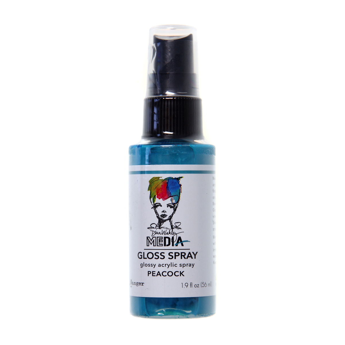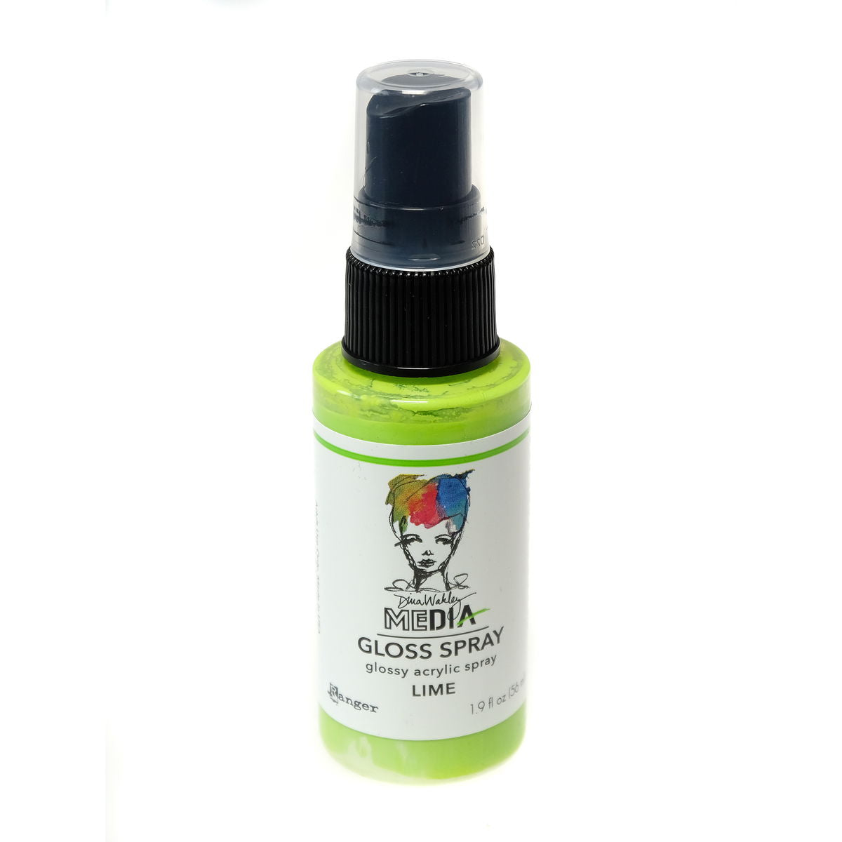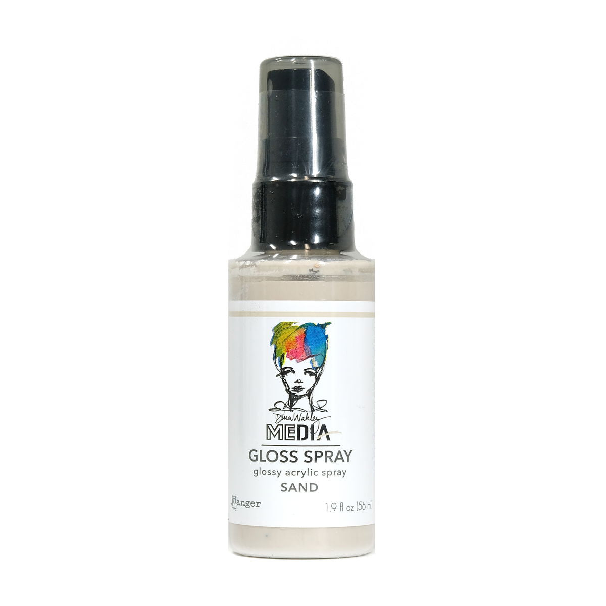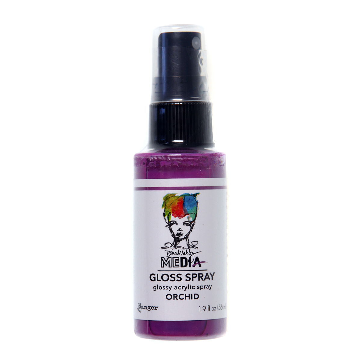 New Dina Wakley MEdia Gloss Spray is an opaque acrylic spray that dries to a glossy finish. Spray into Media Journals, onto Chipboard Shapes, Media Board and other porous surfaces. Gloss Sprays are water-soluble when wet, permanent when dry. All Dina Wakley MEdia Gloss Spray colors are available in a 1.9 fl. oz. spray bottle.