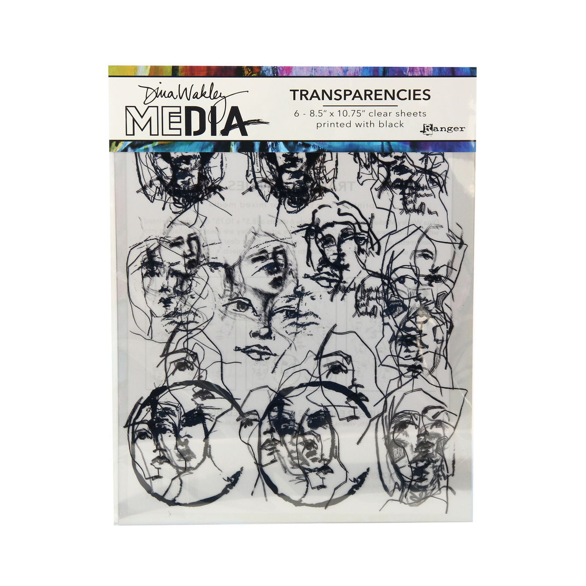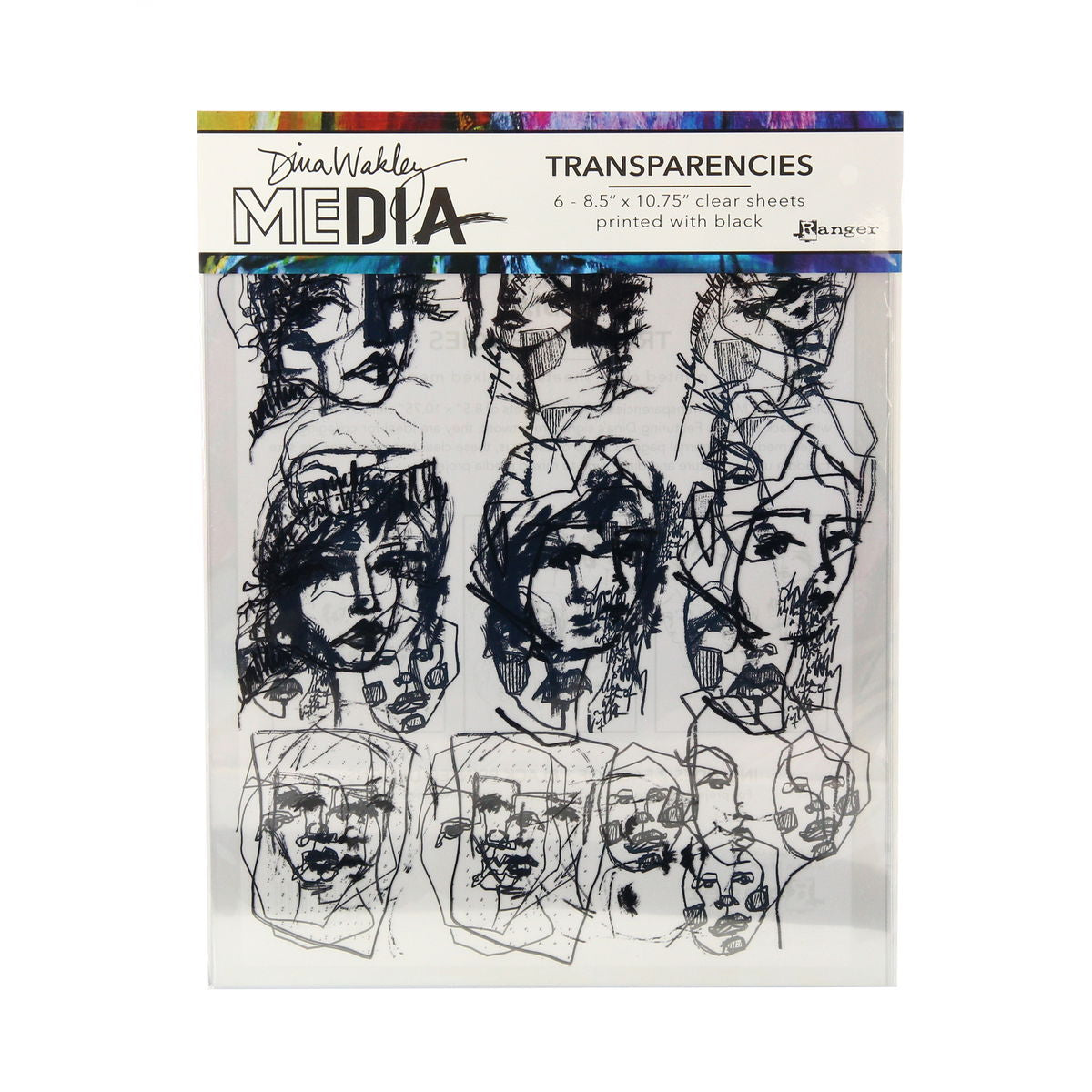 Dina Wakley MEdia Transparencies include 6 sheets of 8 1/2 in. x 10 3/4 in. (21.59cm x 27.3cm) clear sheets printed with black designs. Featuring Dina's signature artwork, they are ideal for collaging into mixed media and journal pages. Just cut them up or use as is. These clear transparencies are sure to add unique texture and dimension to your mixed media projects.