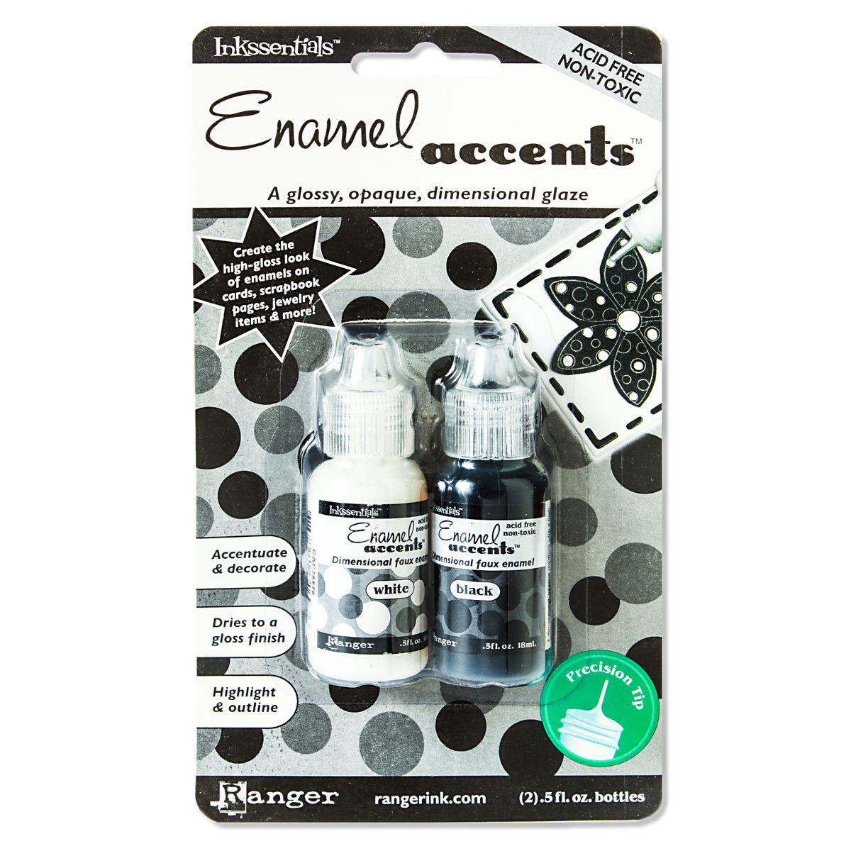 Opaque dimensional accents producing a high-gloss look of black and white enamels in a non-toxic formula. Use this opaque version with a glossy sheen to make doodles, dots, and dashes. Decorate cards, scrapbook pages, stamped images, paper mache creations, jewelry blanks, and more. The set contains two .5 oz. bottles with precision tip needle nose applicators.