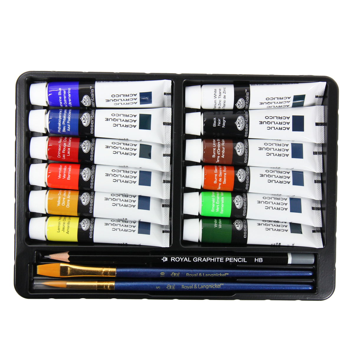 Great for the aspiring artist or the professional, this handy acrylic paint set is conveniently packaged in a durable tin box for easy transport. The Acrylic Painting Art Set includes 10 acrylic paint colors (12 ml tubes), 2 gold taklon brushes (round no. 5, flat no. 10), and 1 graphite pencil.