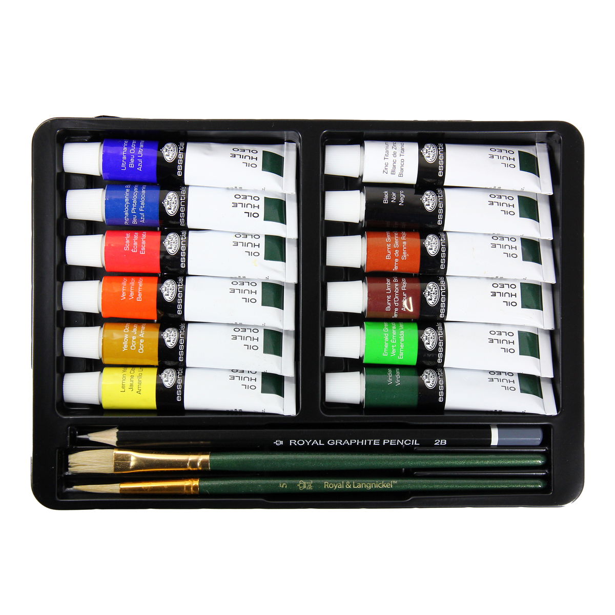Designed with students and aspiring oil painters in mind, this 16-piece essential assortment comes in a convenient tin case for worry-free portability. Supplies are protected and organized in the durable, sleek silver tin. Not only is the set perfect for class and creating on the go, but it also makes a great addition to any arsenal of art supplies. The set includes 12 oil paint tubes (12ml), 2 white Taklon brushes (round no. 5, flat no. 10), and 1 HB graphite pencil. Contains paint colors lemon yellow, yellow ochre, vermillion, scarlet, phthalocyanine blue, ultramarine blue, viridian, emerald green, burnt sienna, burnt umber, black, and titanium white.