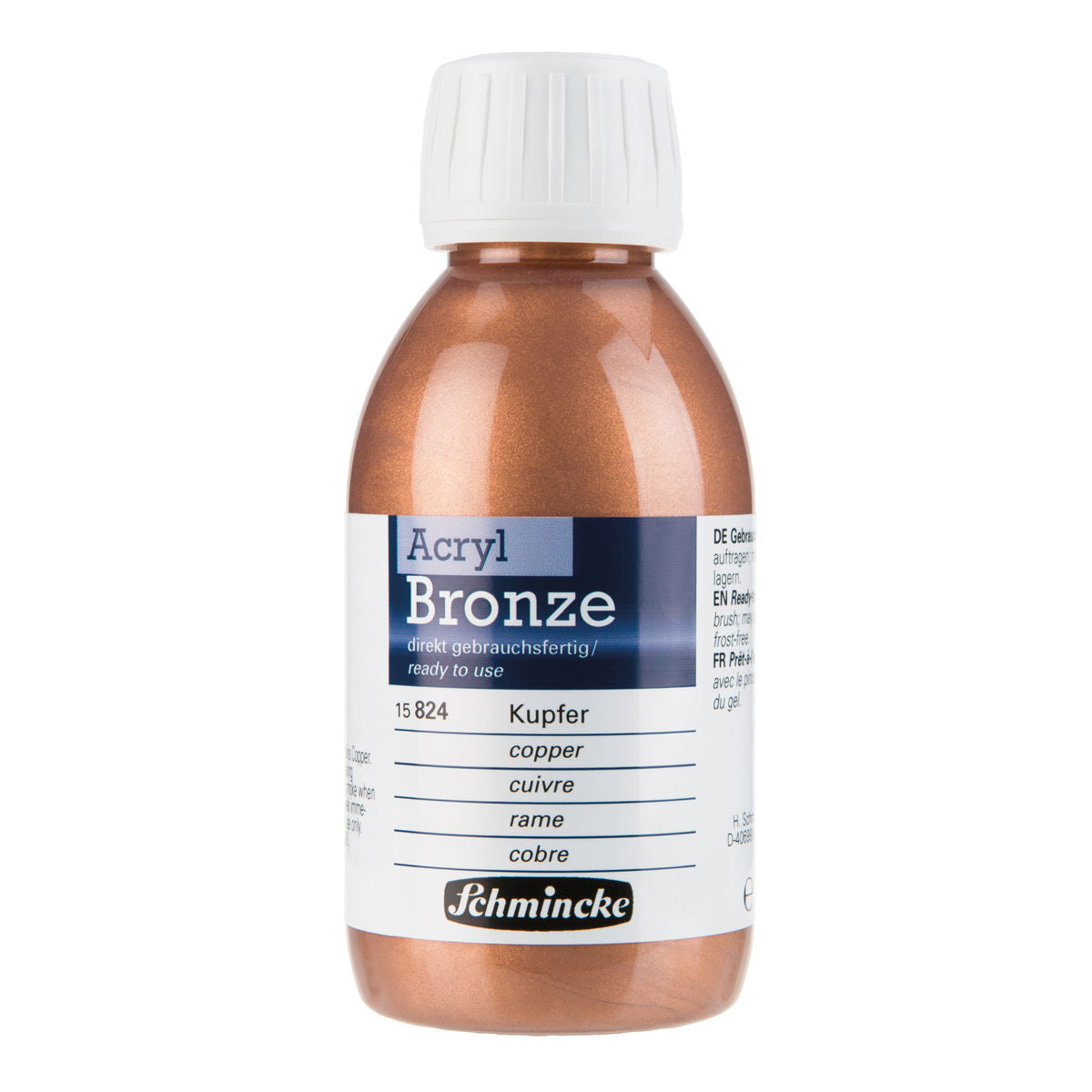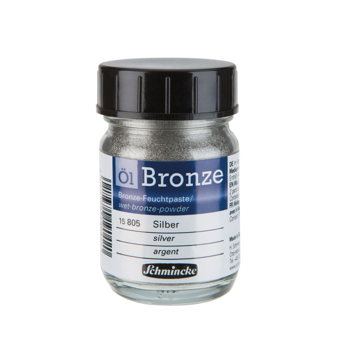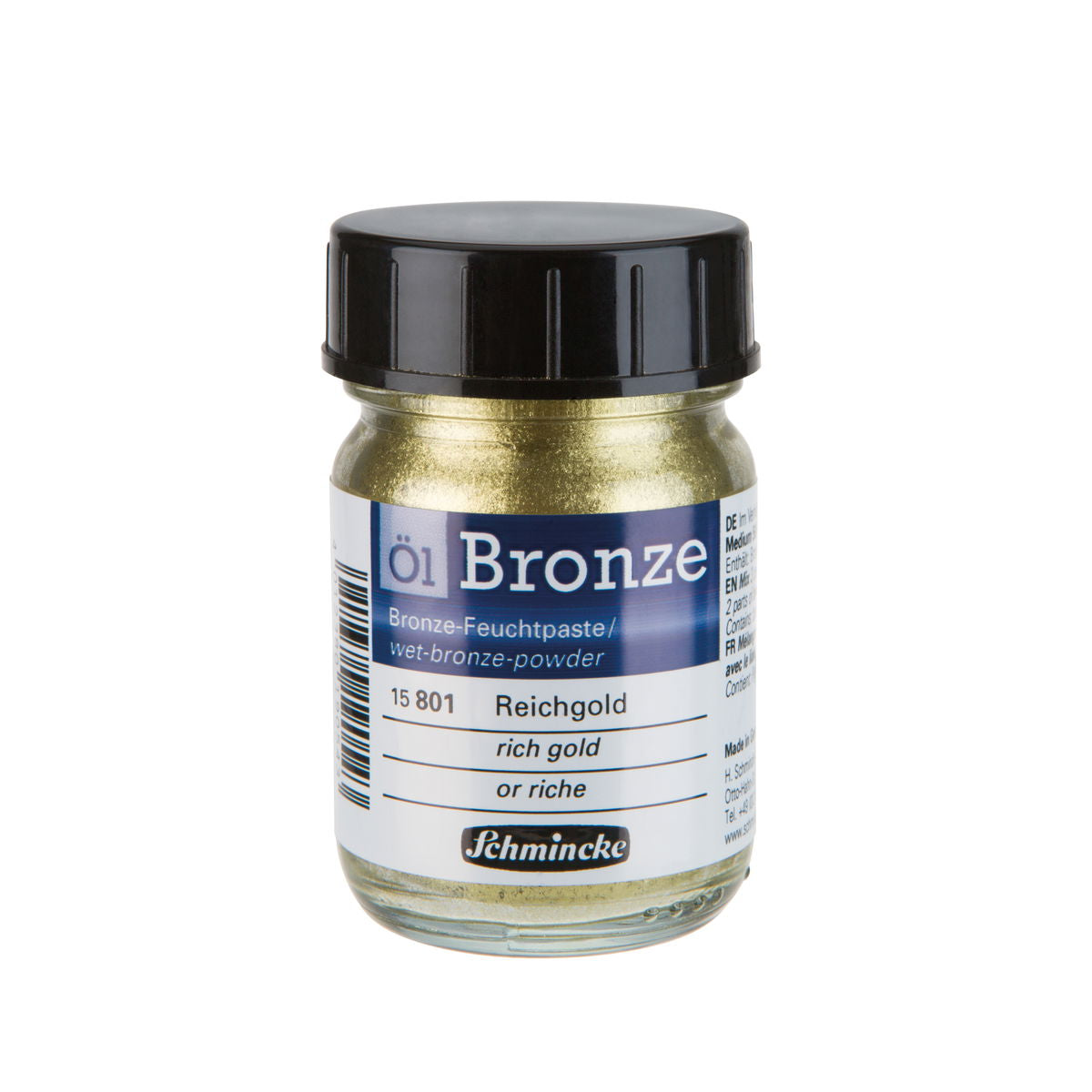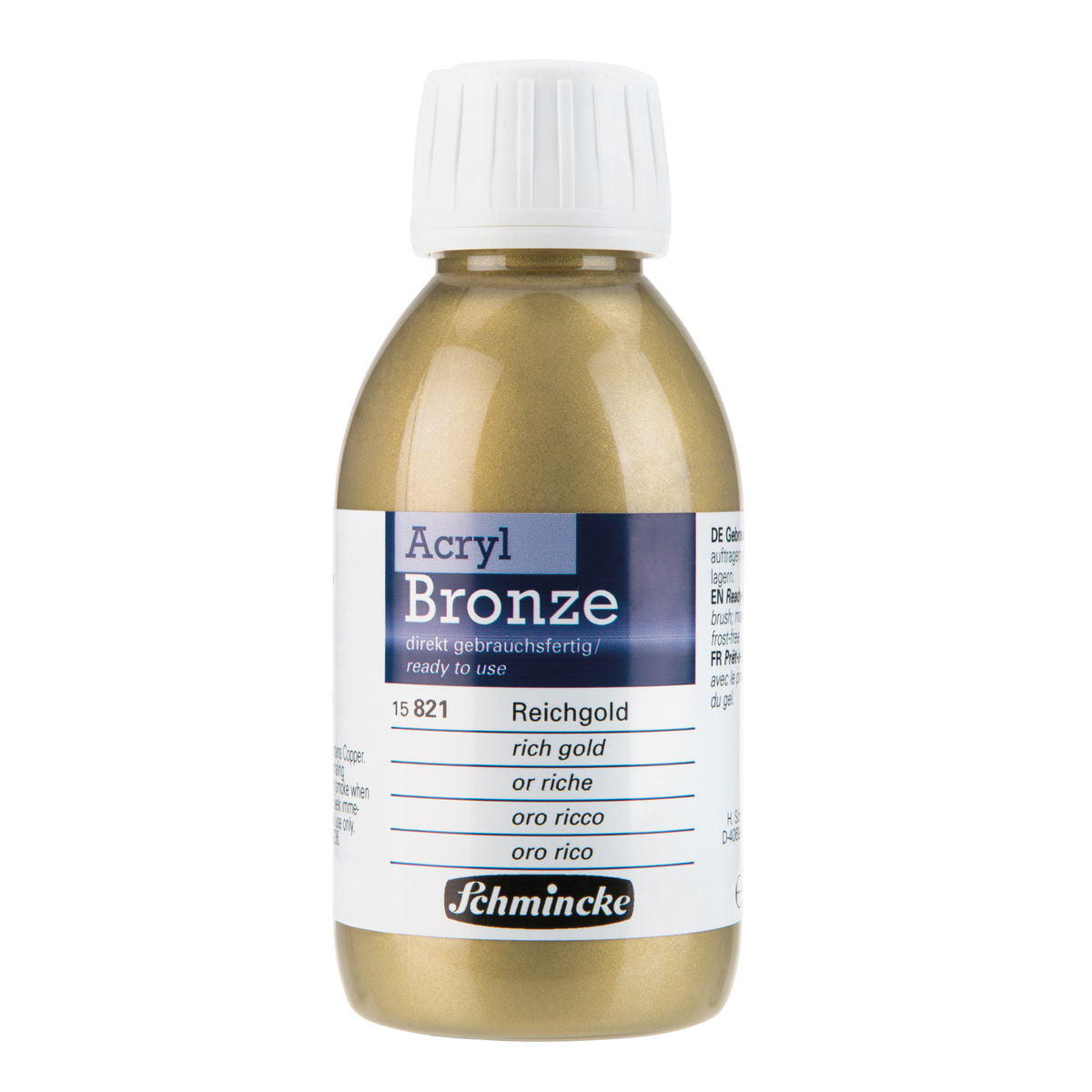 Based on real metal pigments, Schmincke Artists Bronzes are formulated specifically for oil, acrylic, and watercolor painting techniques. They contain bronze or aluminum pigments, making them more vibrant and opaque than metallic effects made of pearl pigments. Available in 5 different colors: rich gold, rich pale gold, pale gold, copper and silver. Acrylic bronzes: Ready to use acrylics. Suitable for paper, wood, metal, plastic, or gypsum. Can be diluted with water. Dry permanently. Aqua bronzes: Work best on the following surfaces: paper, cardboard, painting board and canvas. Mix with little water on a palette before applying. Oil bronzes: Suitable on pre-primed surfaces, wood, metal, or gypsum.Compatible only with the Schmincke bronze medium. Use a palette knife to mix 3 parts Oil-Bronze and 2 parts bronze medium before applying.
