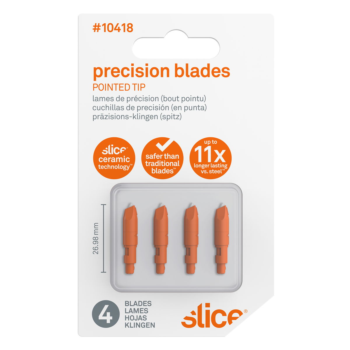 Slice Box Cutter Blades with pointed tips are compatible with multiple Slice tools, including Box Cutters, Pen Cutters, Mini Cutters, Slim Cutters and the EDC folding knife. The unique finger-friendly design means the four blades in this pack are safe to the touch, so cause fewer and less severe injuries than traditional blades. For added safeguarding they re also non-conductive. Pointed tips allow users to initiate a cut by puncturing, which is particularly useful if you re cutting tough materials. Each blade is highly durable, lasting on average 11.2x longer than traditional blades, and never rusts because it s chemically inert. Finger-friendly blade is the only safety blade on the market Pointed tip for initiating cutting by puncturing/li> Non-conductive blade for added safety/li> Chemically inert blade that never rusts/li> Slice blades last 11.2x longer than traditional blades/li> Reversible blade doubles lifespan/li> No oil coating/li> Pack of 4 blades to support multiple tools or have multiple spares/li> Great for: Opening cardboard boxes and packages Slicing tarps and plastic sheeting Tougher materials when you need to initiate a cut by puncturing